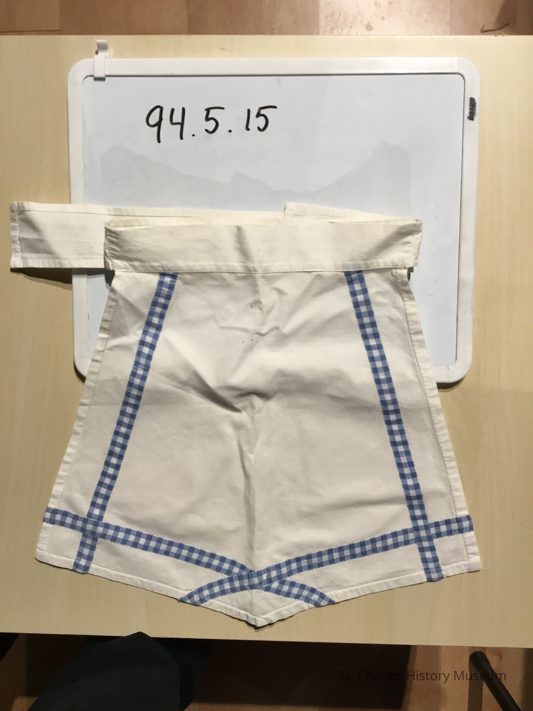 White cotton apron. Blue gingham border across bottom and down both sides. Apron comes to point at front center. 83 " long set on band with ties. Stamped on back "BLA" "44X4". belonged to Anne Lucas McFarland when she worked at Gartners Bakery, 1938.Dimensions