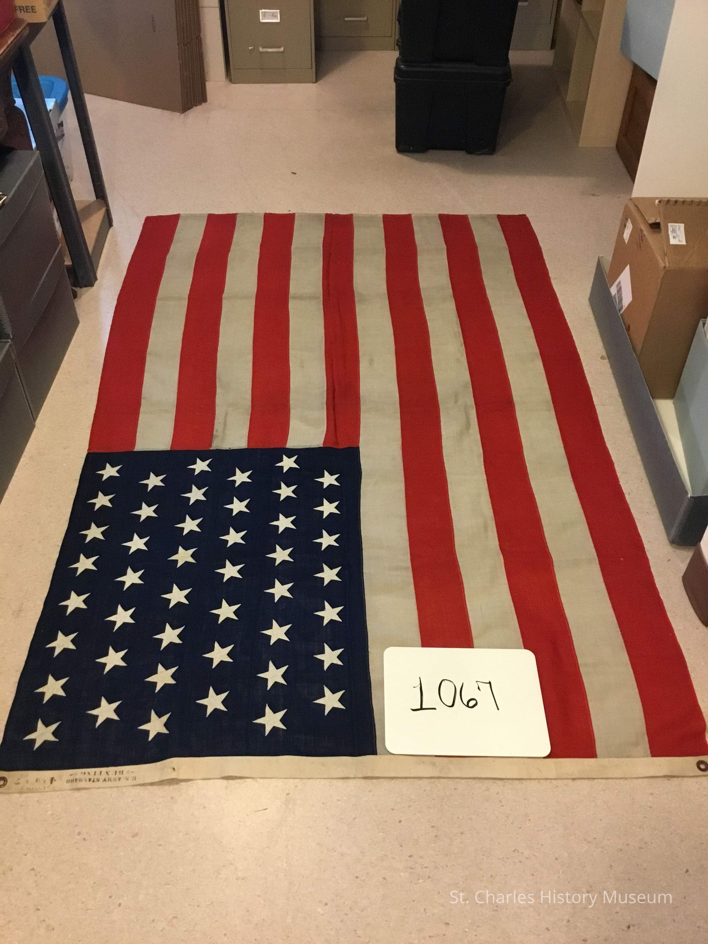 Old American flag: 45 stars....by E.P. Phillips. Donated by Norma McConkey. "U.S. Army Standard Bunting" printed on margin....4 1/3" x 7".