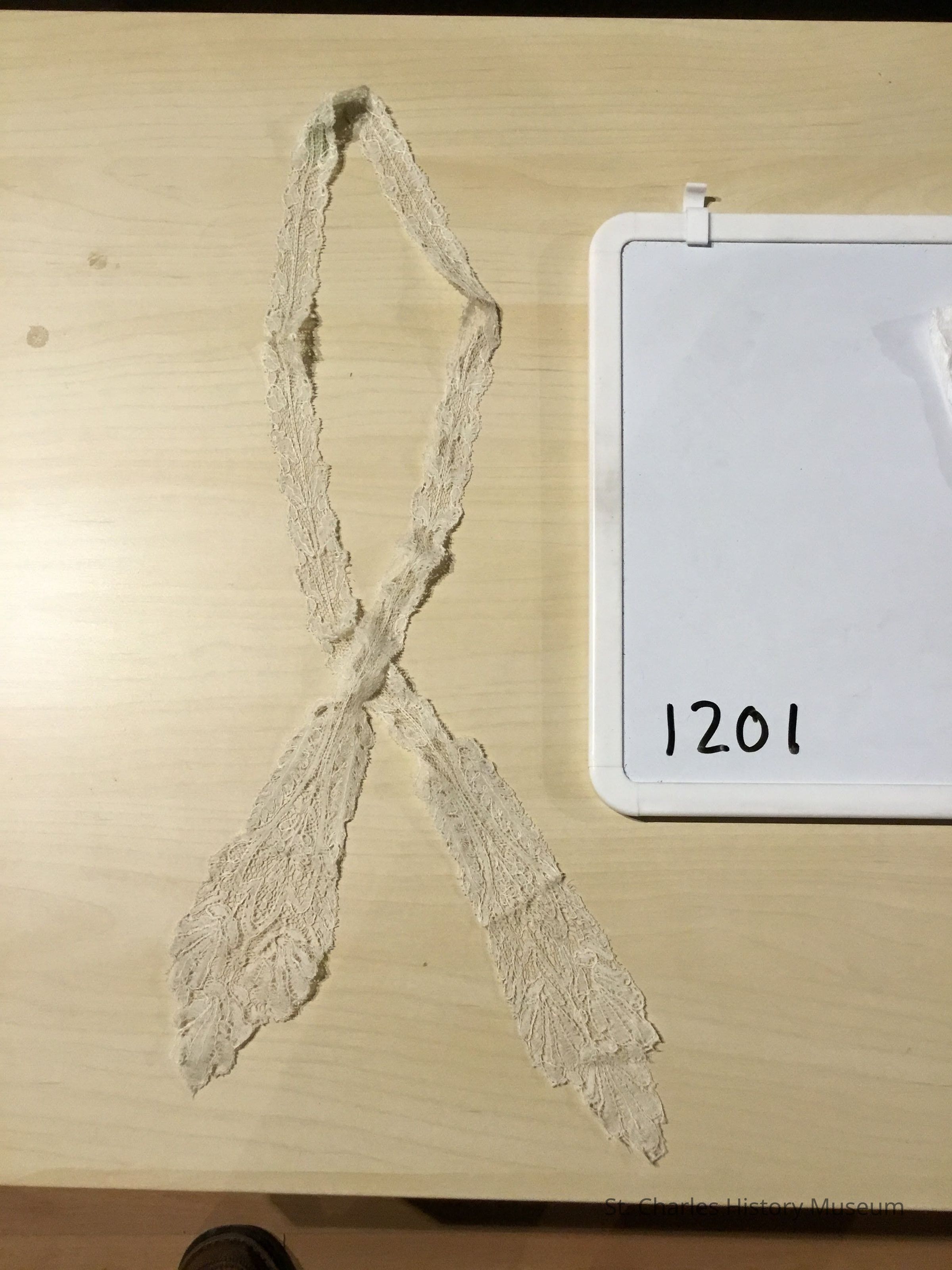 Woman's tie; fine lace, narrow band with ends wider; brought to this country from Sweden by Winifred Colson's grandmother