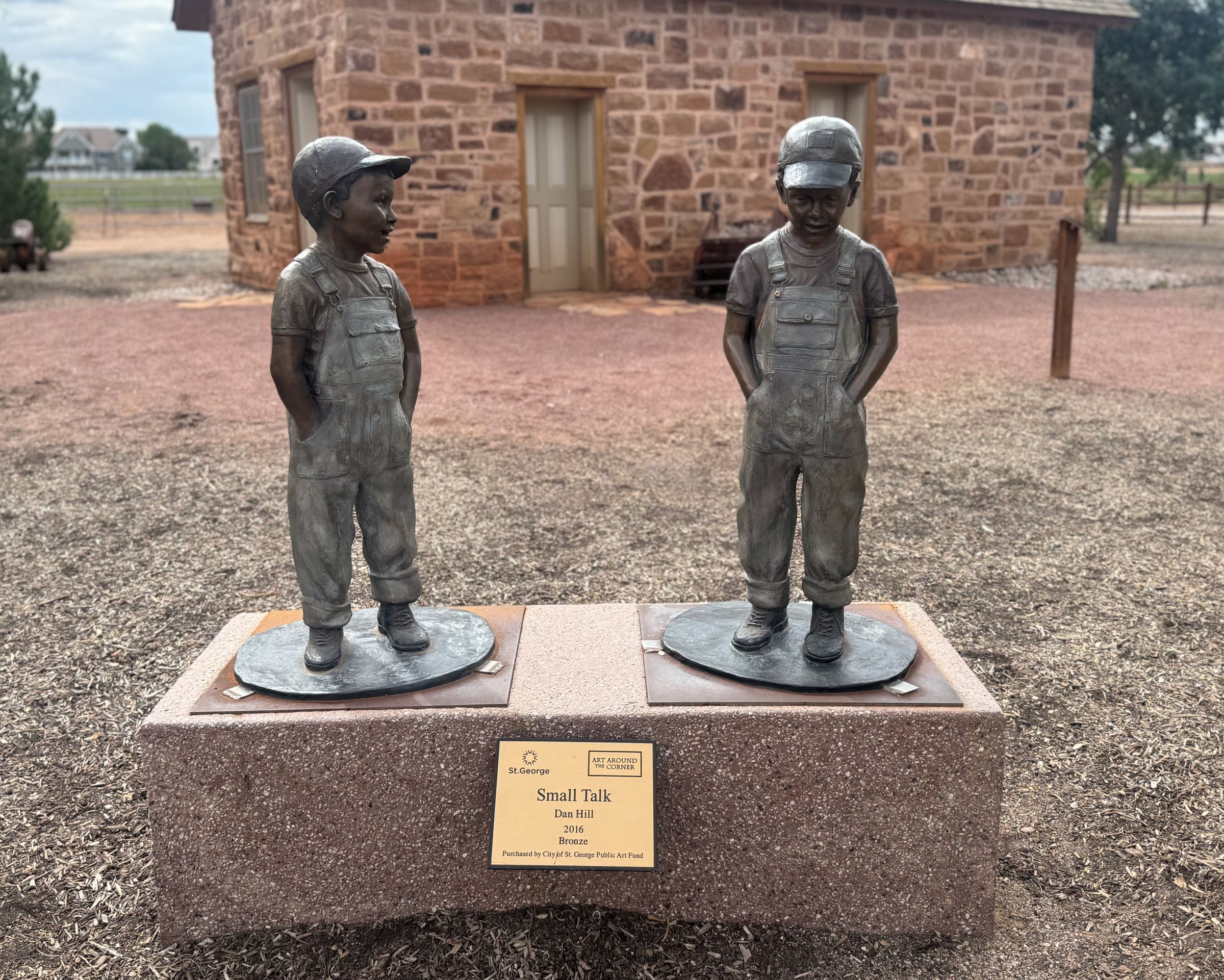 Two bronze statues of young farm boys in conversation wearing overalls and hats with a slingshot in their pockets.Acquisition