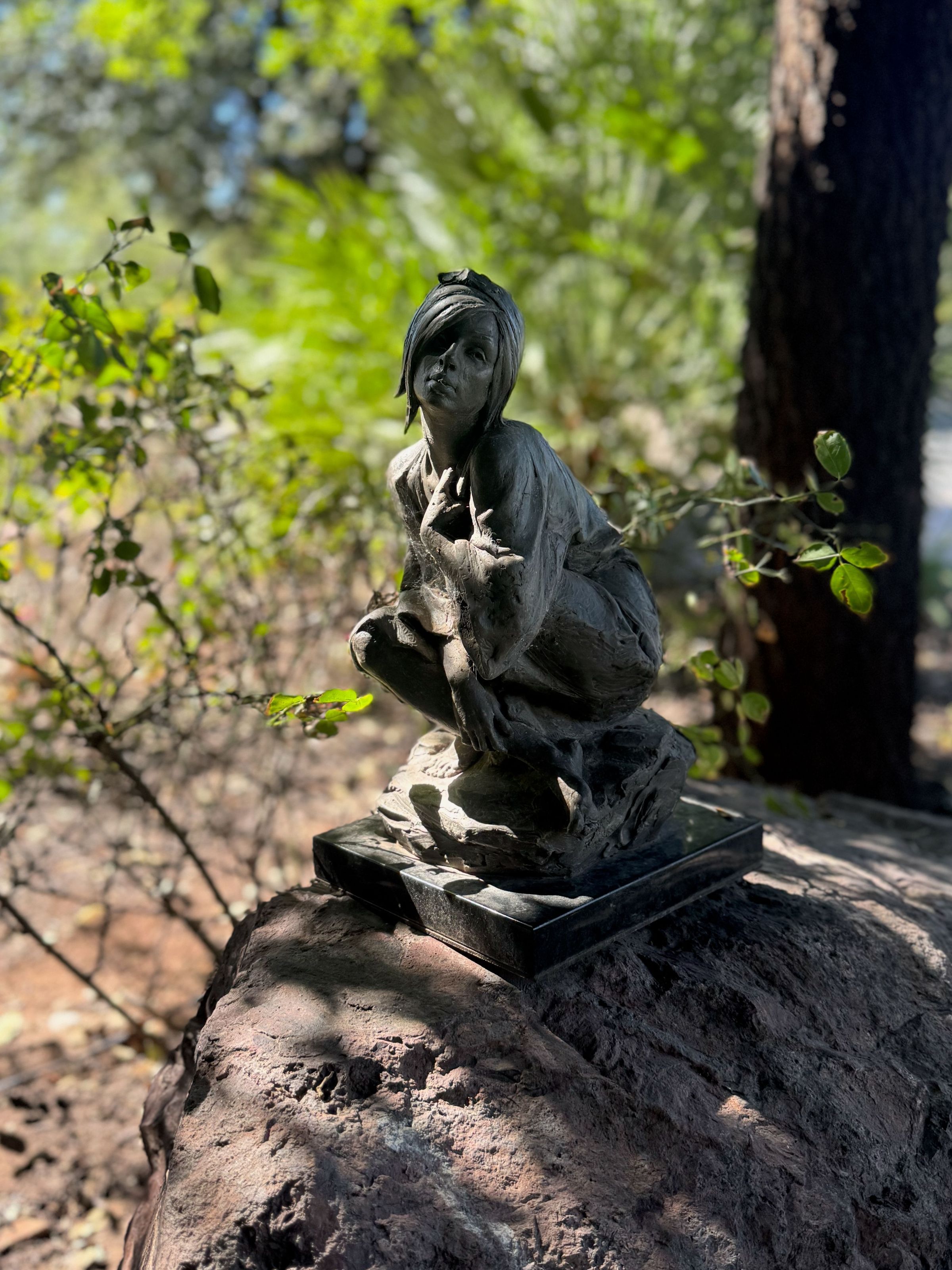 Bronze Sculpture of a woman crouching down on a rock.