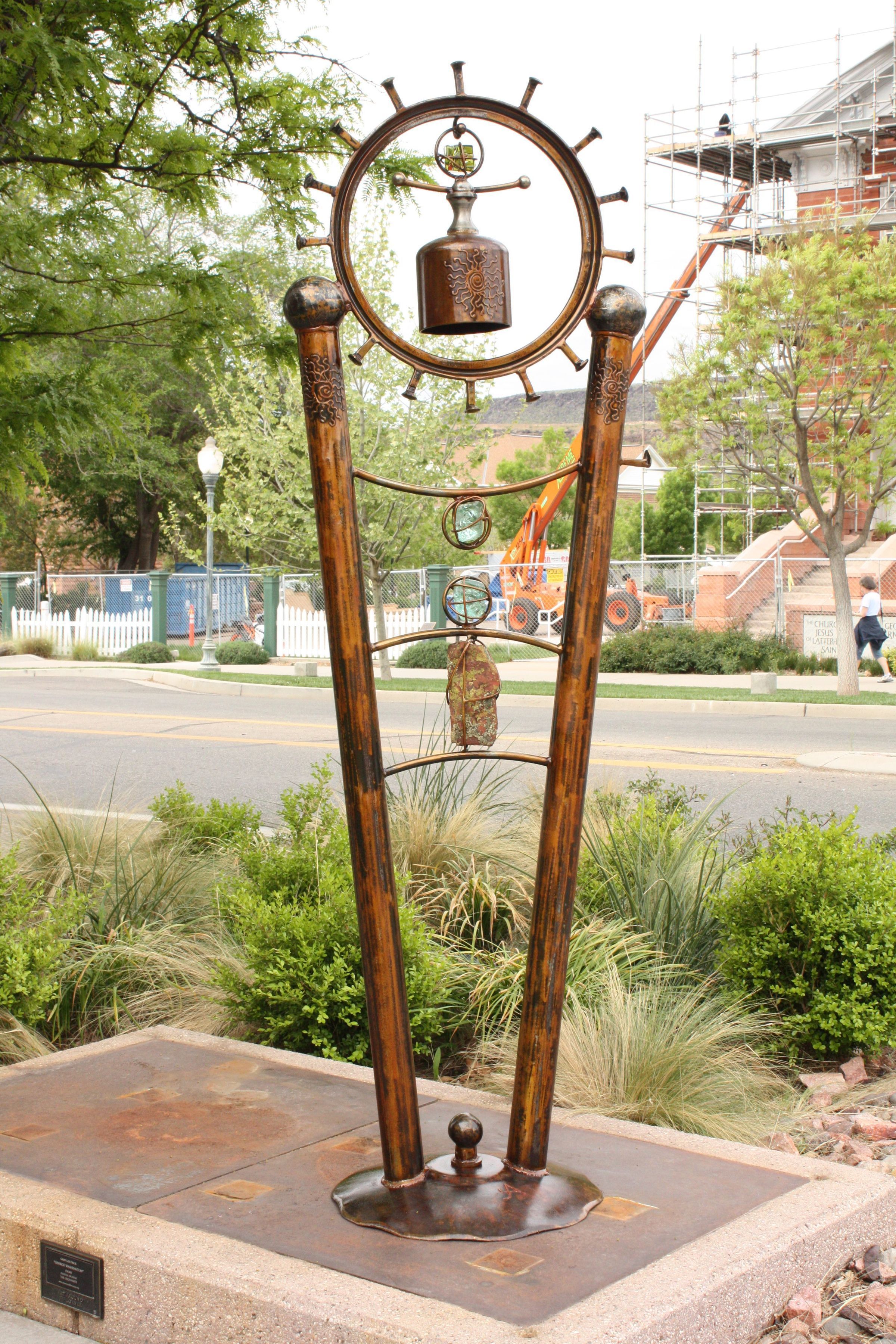 Mixed metal sculpture of a bell created by using part of a cylinder tank suspended in a circle.