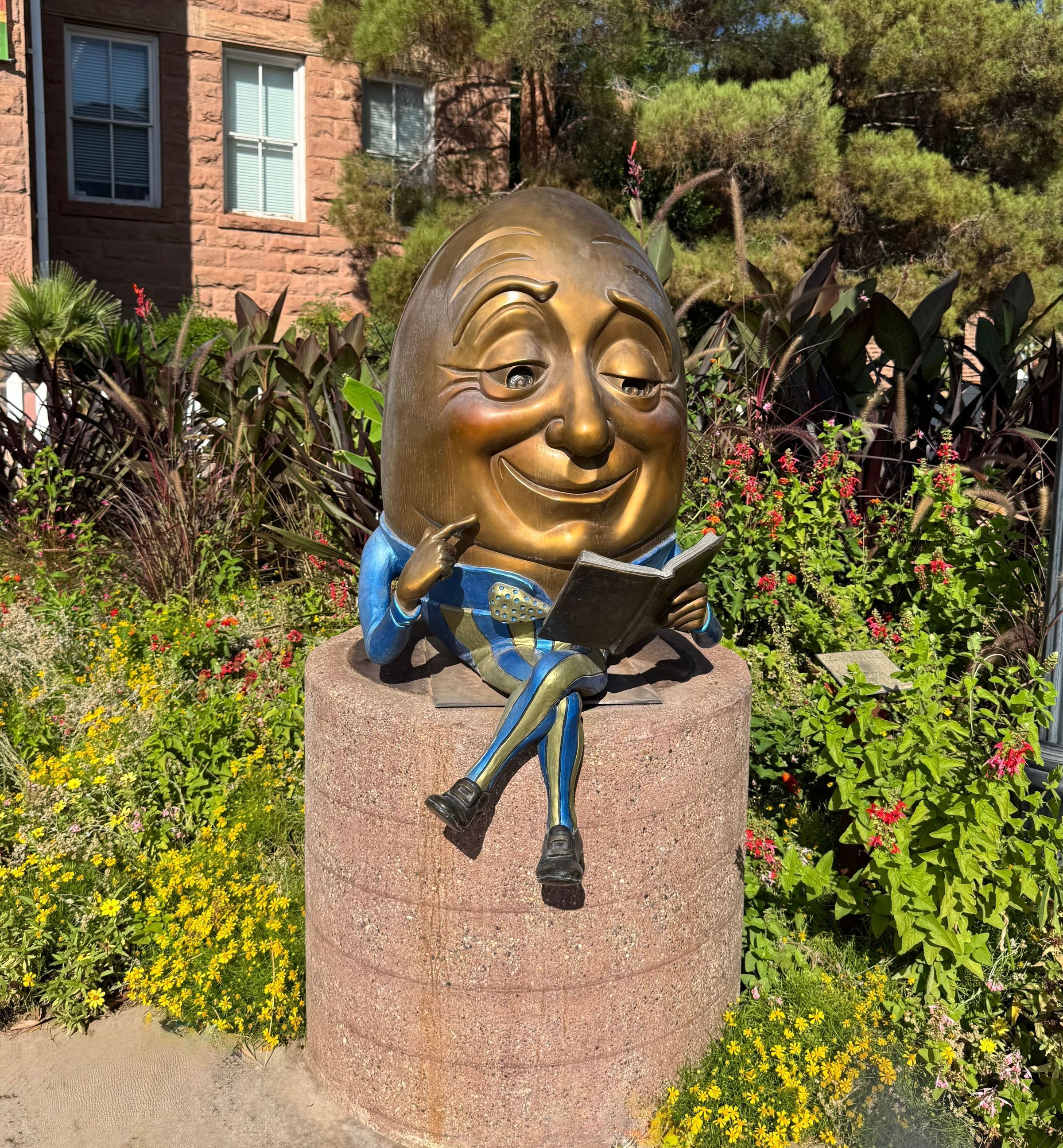 Bronze sculpture of Humpty Dumpty sitting and reading a book with a finger on his chin.