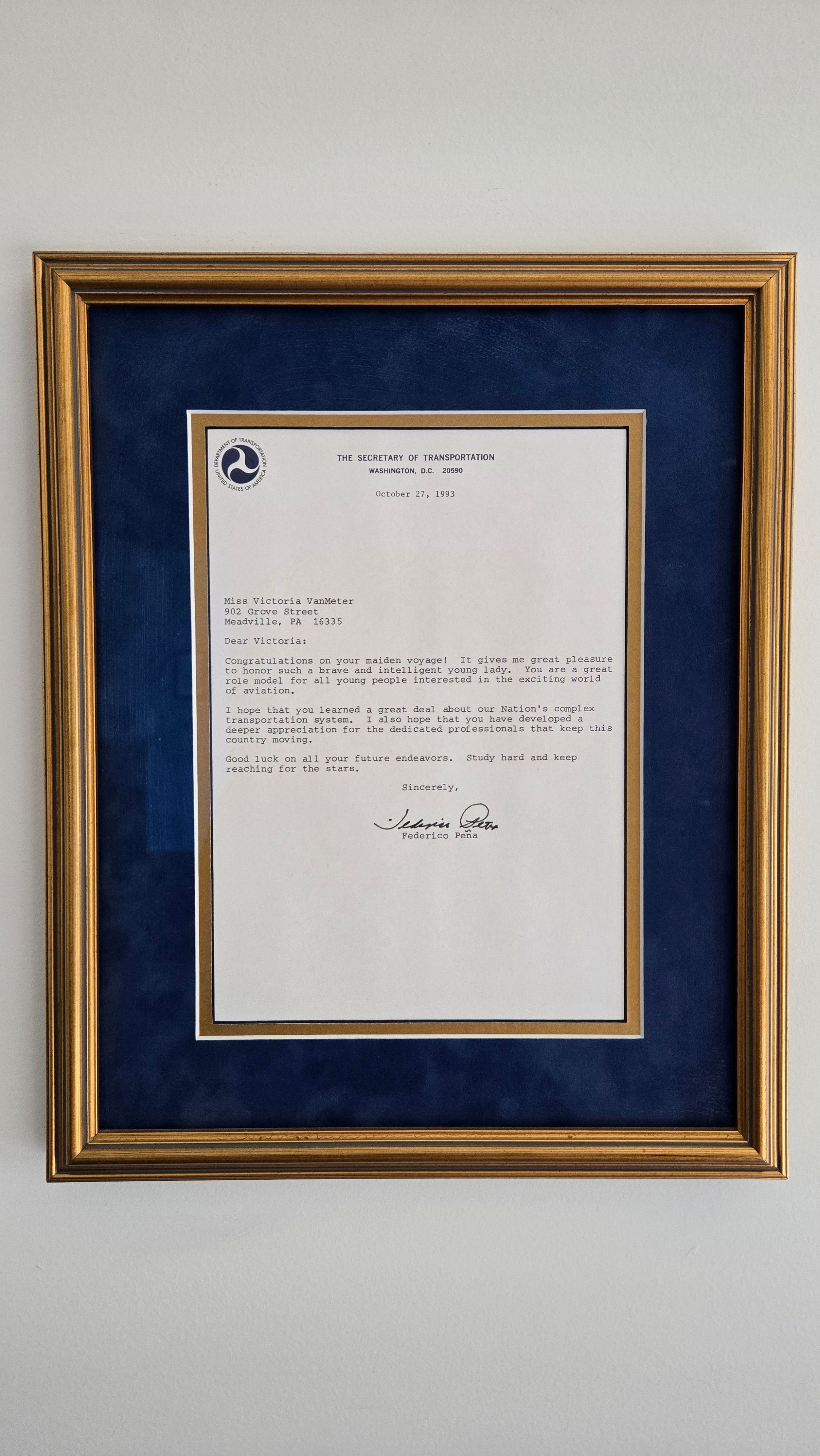 Framed letter from Frederico Pena, Secretary of Transportation, congratulations on maiden voyage, dated October 27, 1993