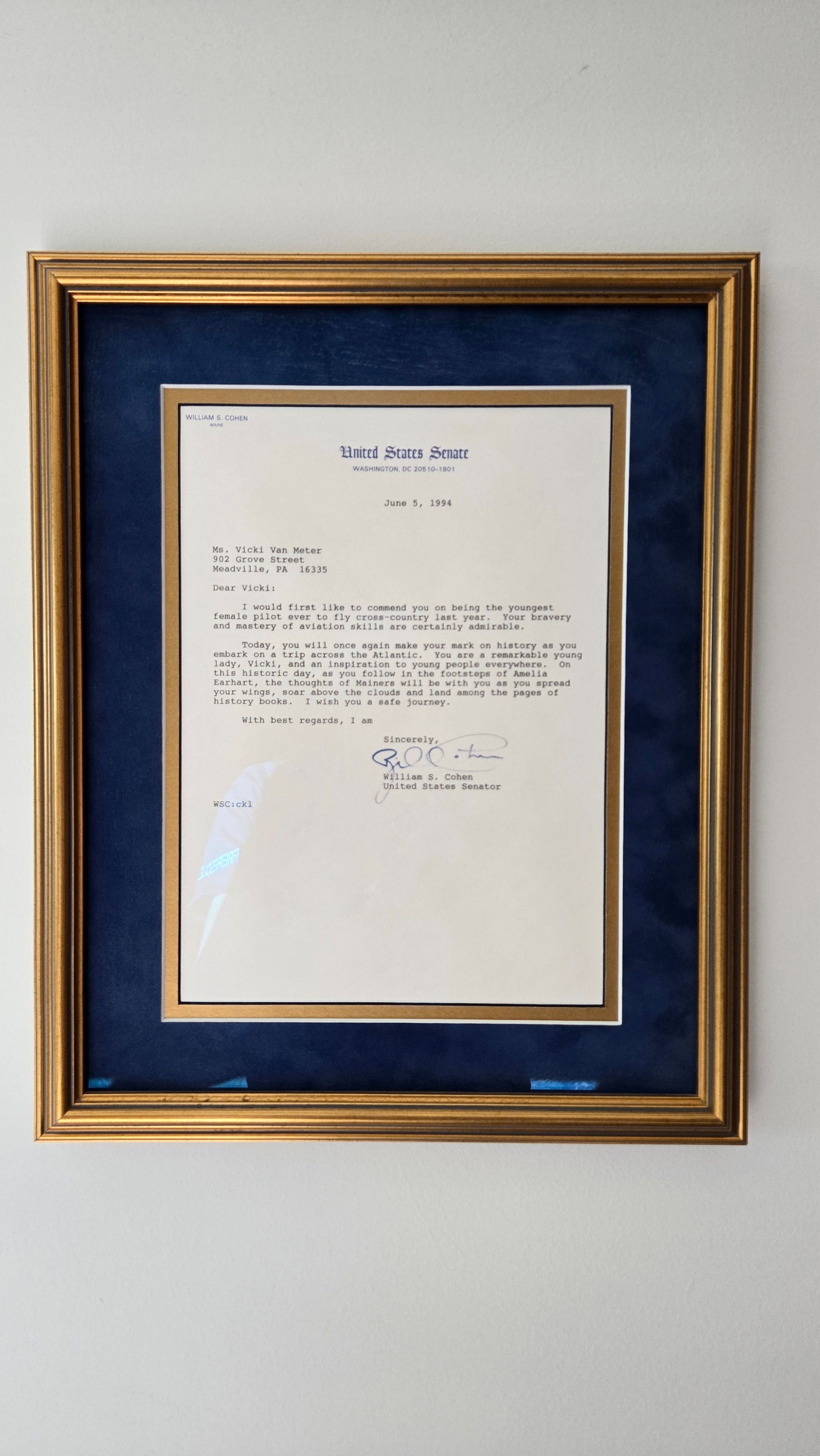 Framed letter from William S. Cohen, United States Senator, commendation on youngest female pilot to fly across country, dated June 5, 1994Acquisition