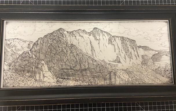 Ink drawing of landscape of mountains