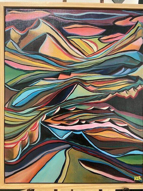 Smaller brightly colored abstract painting with natural wood frame.