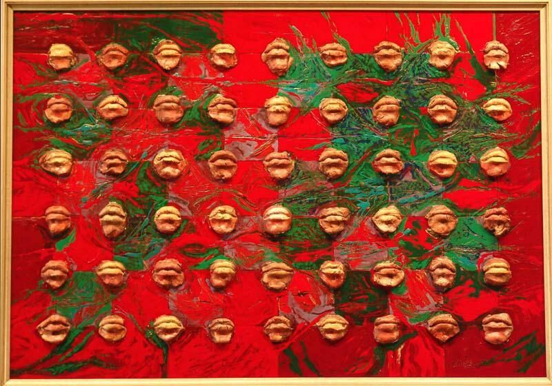 mixed media painting - ceramic lips on red and green oil base background, 29" x 40"