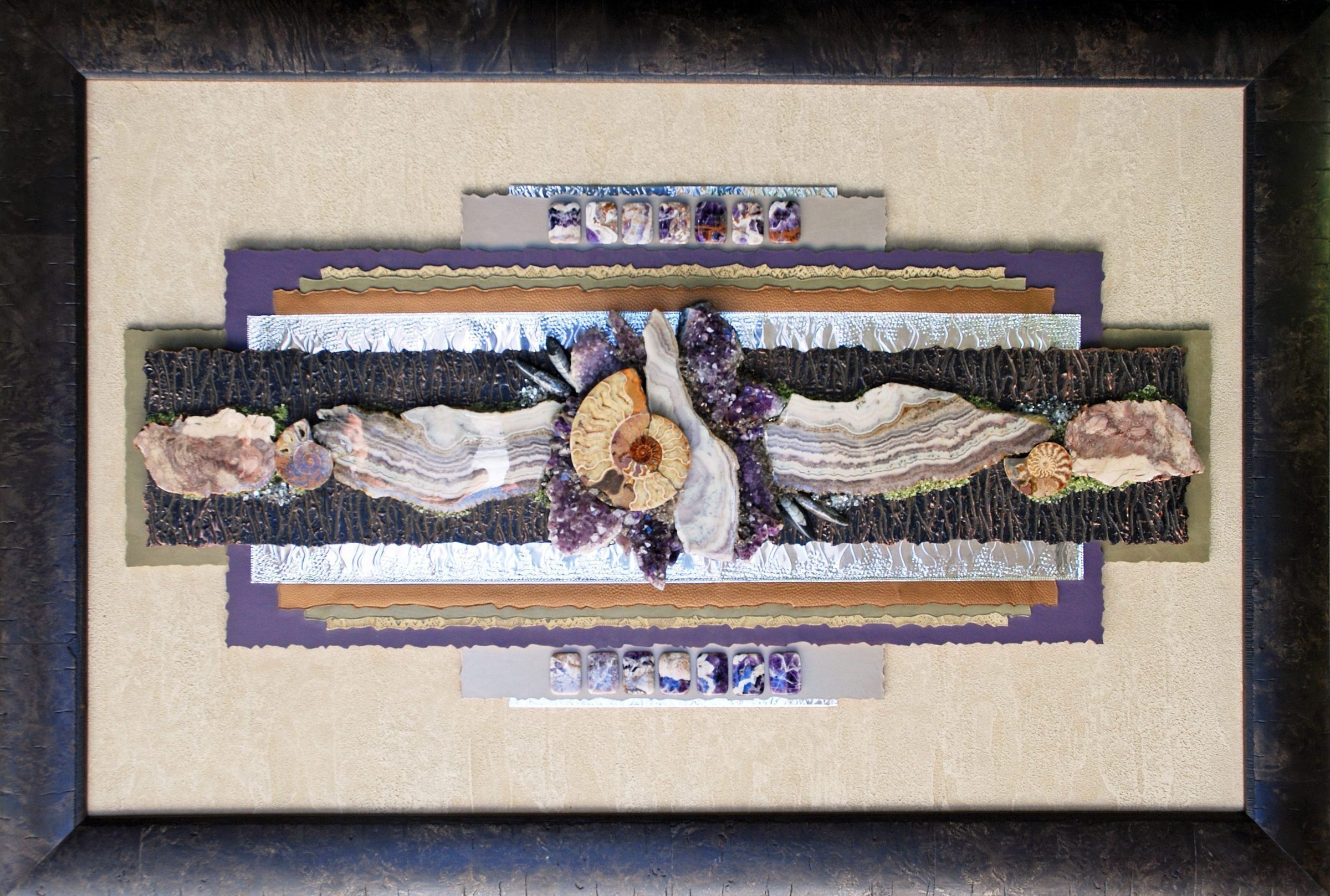 Mixed Media three-dimesional wall hanging comprised of semi-precious stones, fossils, crystals, leather, and metal.Acquisition
