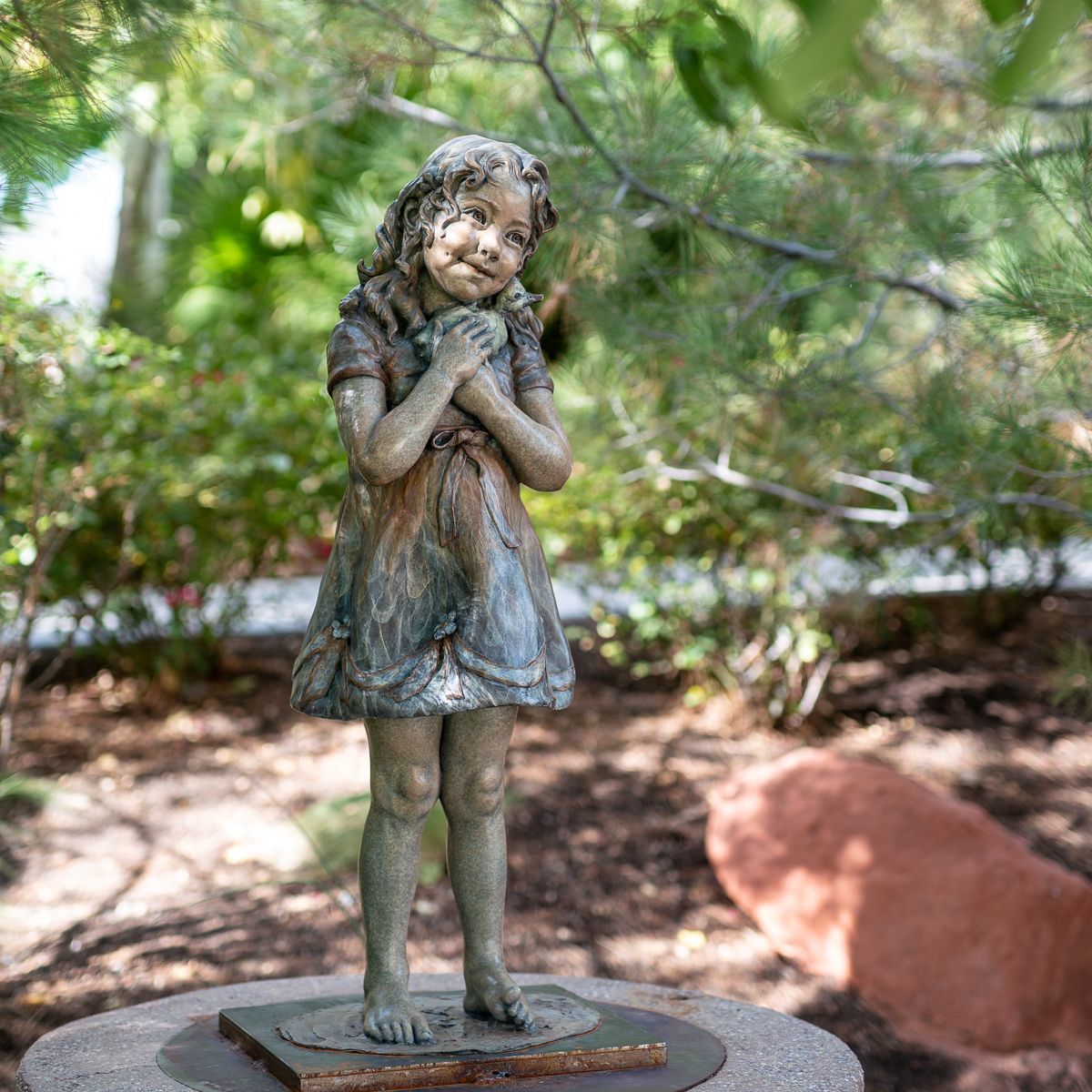 Bronze sculpture of a little girl holding baby ducks close to her chest. Multi-colored organic patina on a granite baseAcquisition