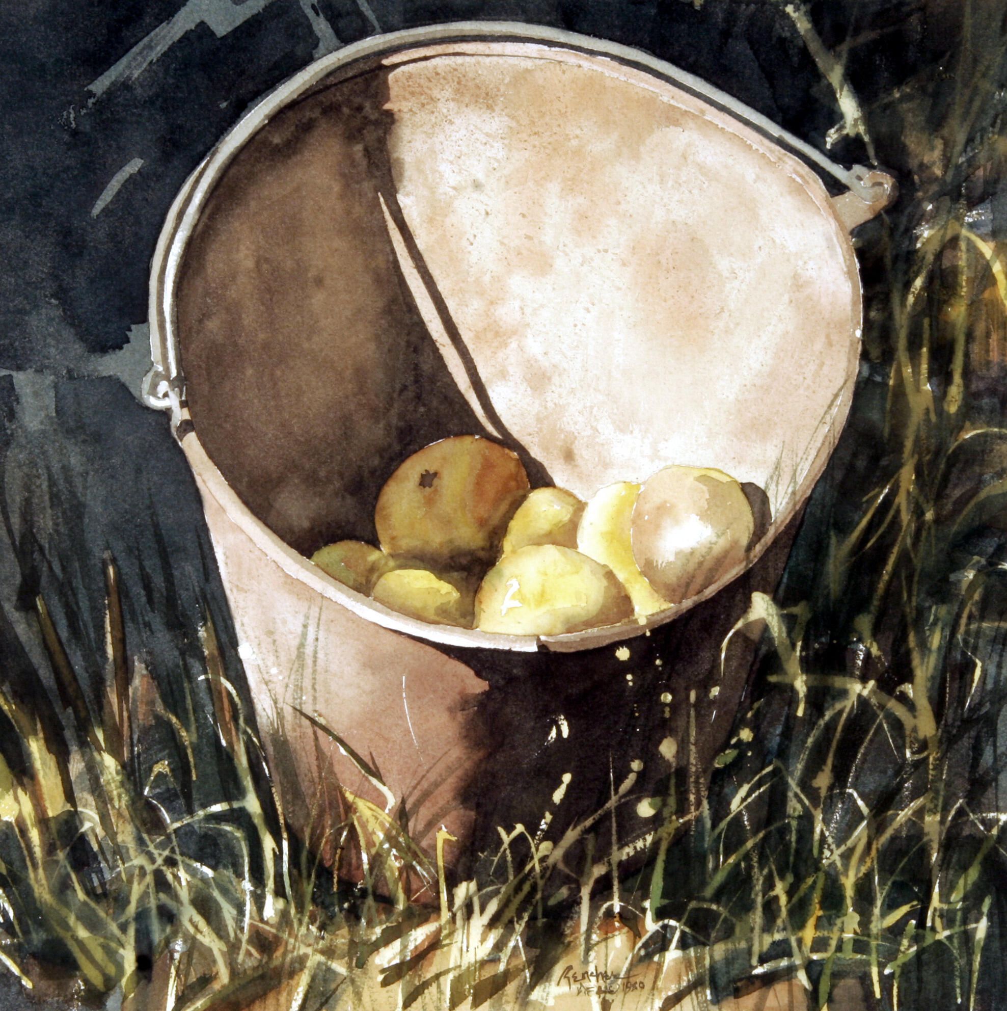 Close up view of a metal bucket containing yellow apples. The bucket is sitting in grass or weeds. Sunlight illuminates the interior of the bucket.