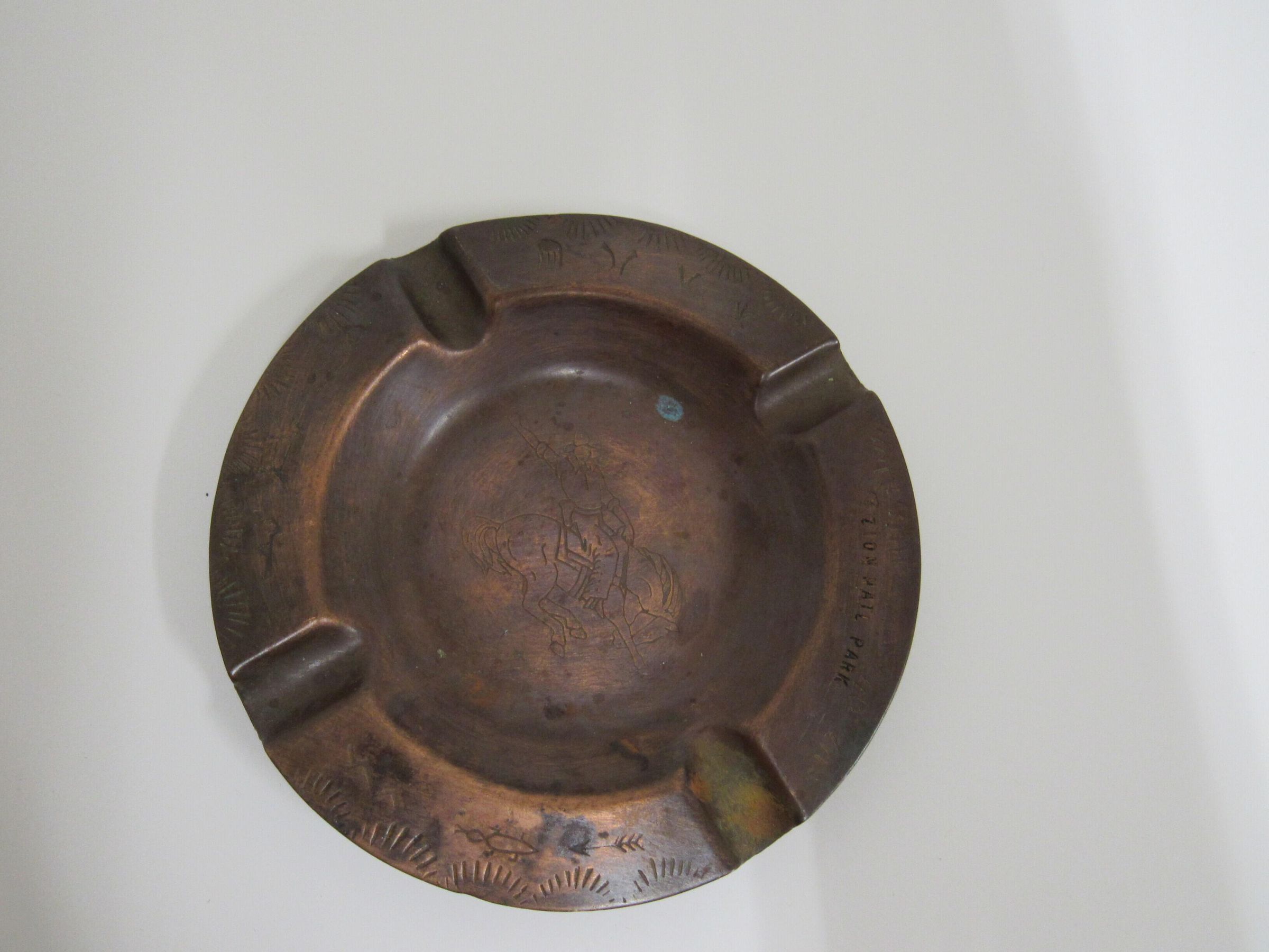 Commemorative Ashtray, engraving of cowboy on bucking horse and inscription, Zion Nat'l Park.