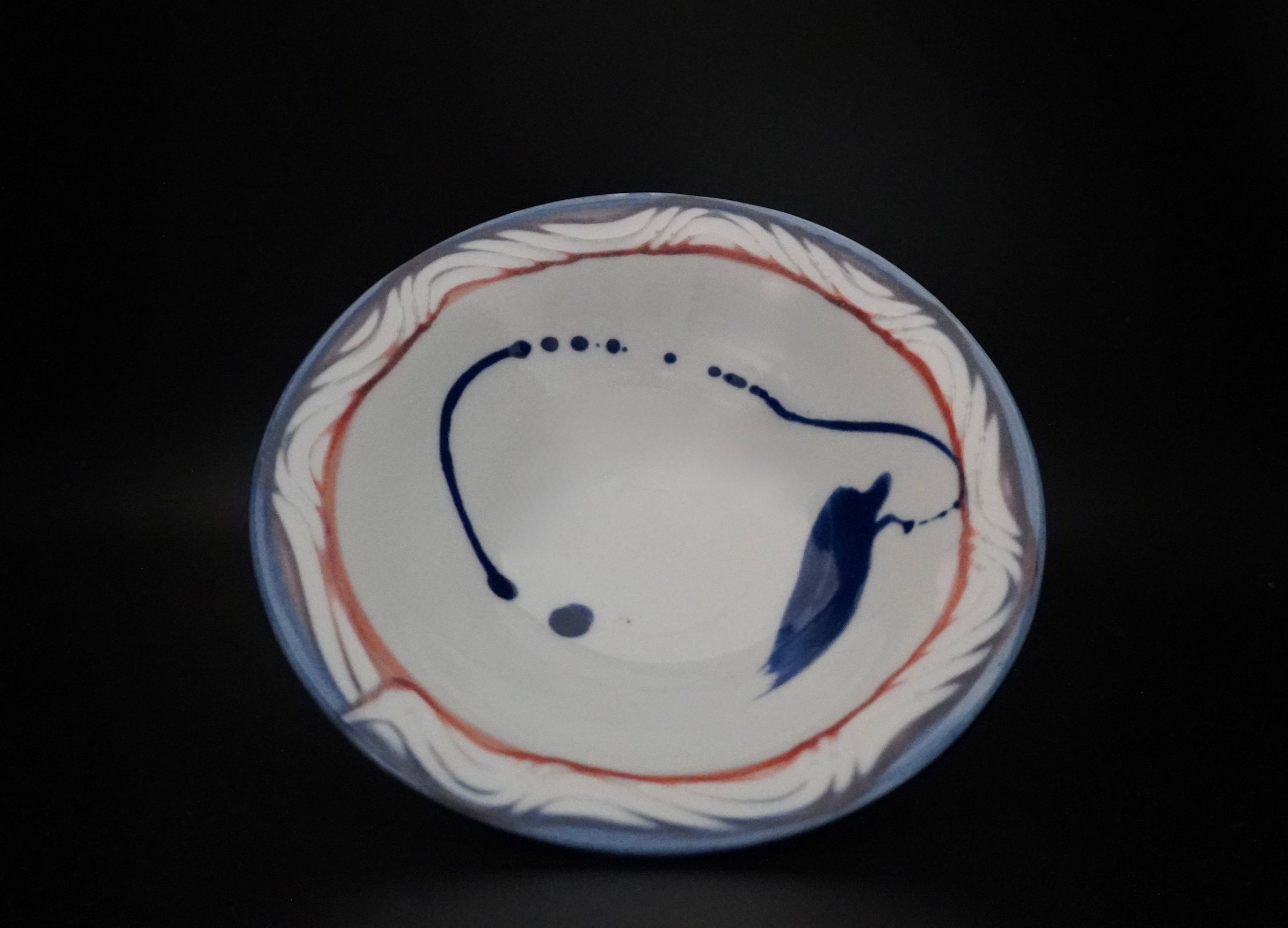 Small bowl with signature Blakley swirls on rim. Blue glaze dripping in center of bowl. Glazed PorcelainAcquisition