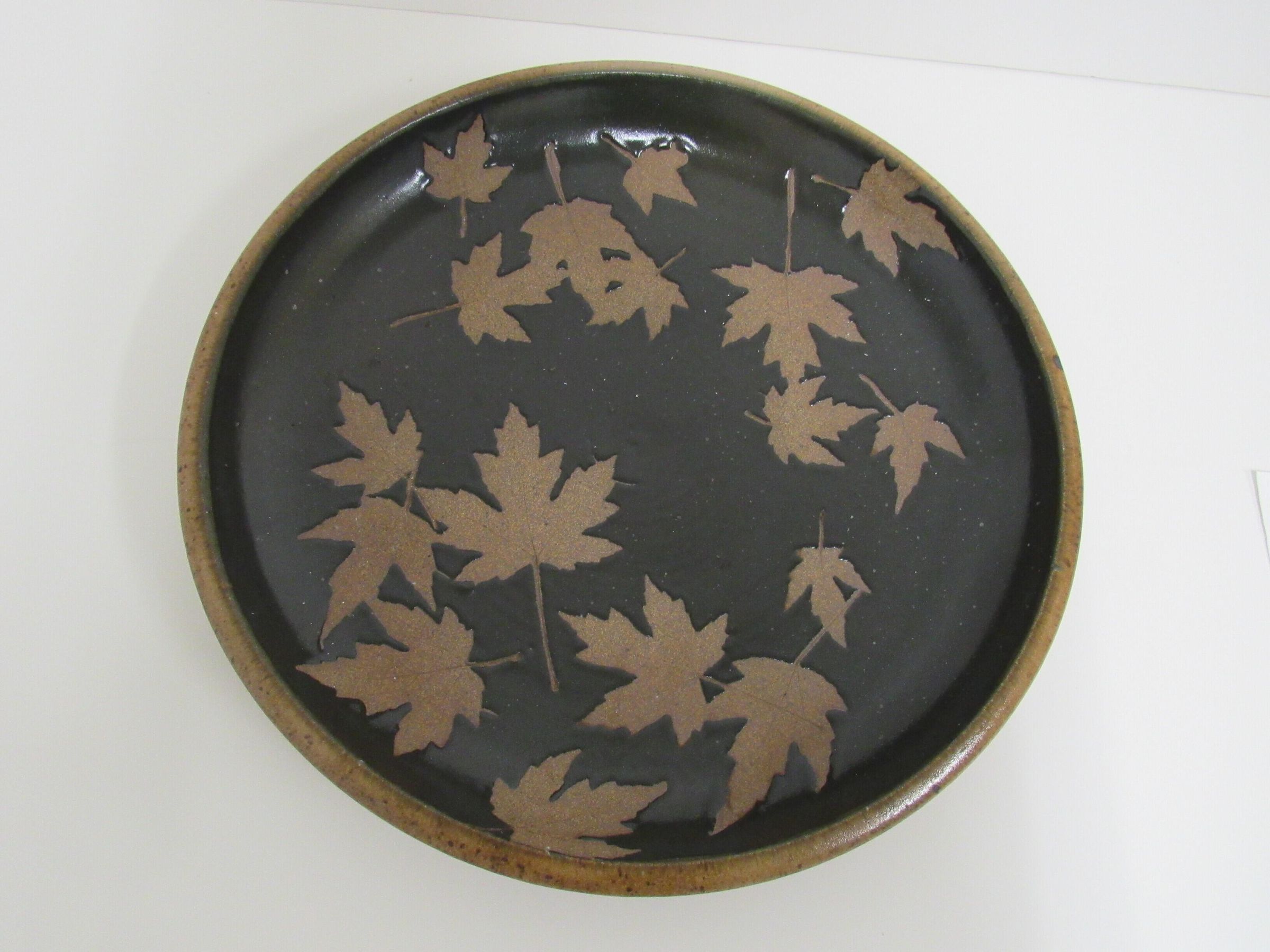 Black/Brown Ceramic platter 16.75 in. dia. with leaf designs throughout.