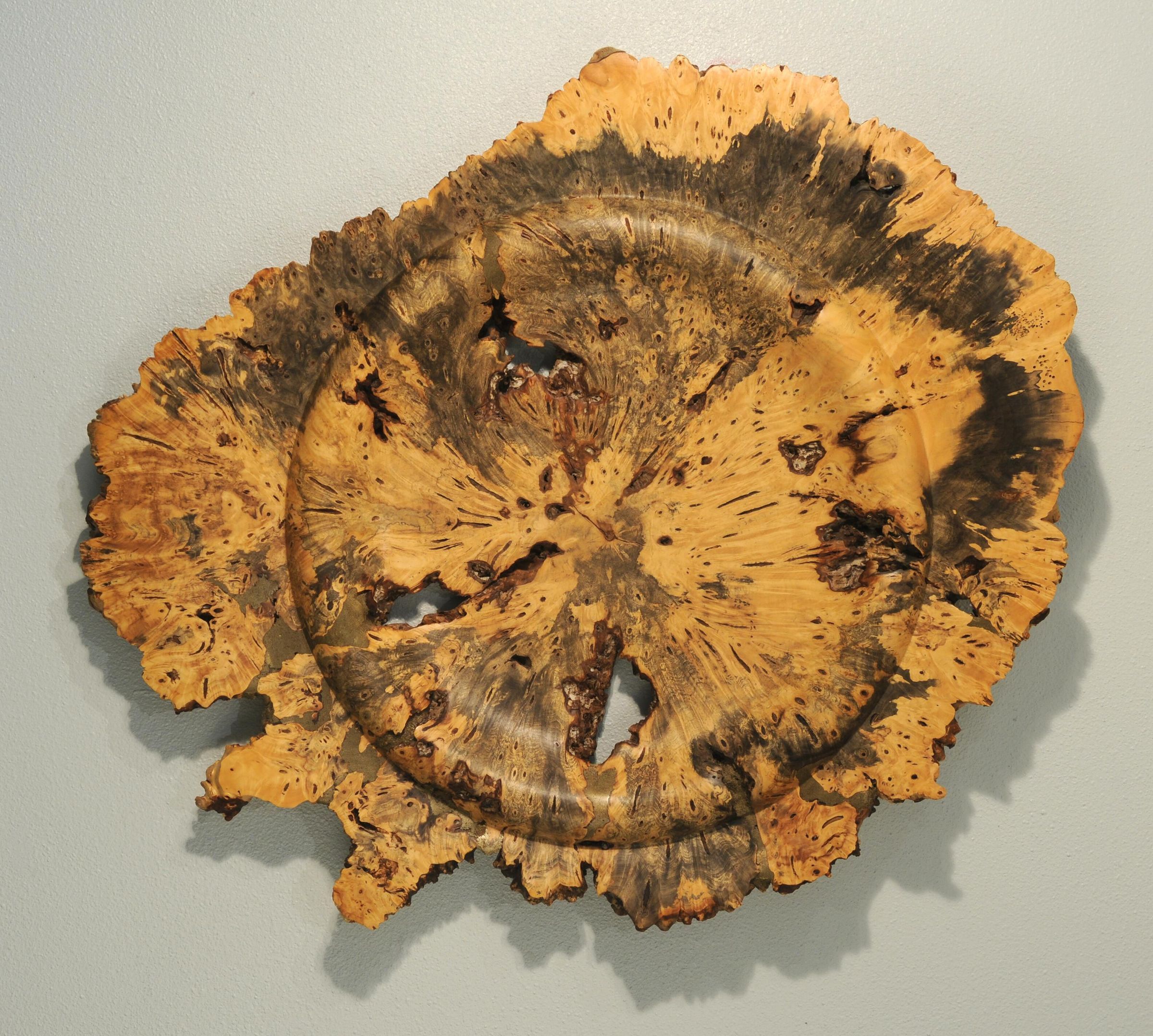 Turned wood platter of buckeye burl, approx 29 x 36