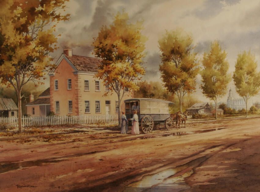 Fronting a dirt road is a pioneer house, in front of which is a wagon pulled by several horses. Inside the wagon are two figures who are talking with two standing figures on the dirt road. There are three other structures along the road, the last of which is the St. George Temple. Leafy trees extend down the side of road.Acquisition
