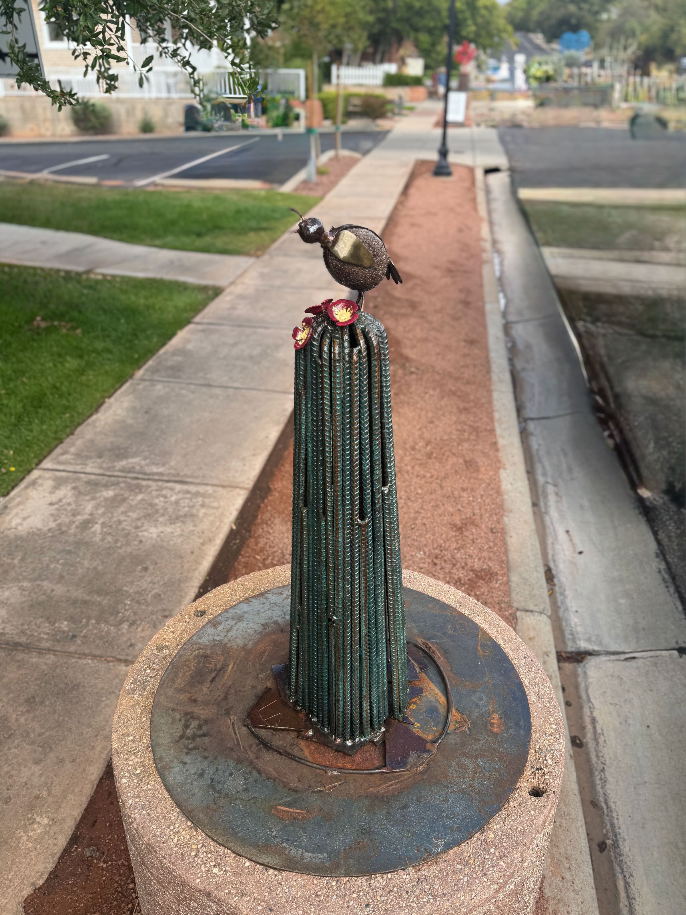 Bird on top of a small green cactus made of rebar with four red flowers