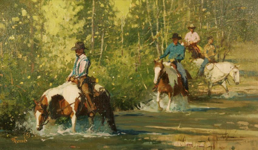 Four riders on horses splashing through a stream in a diagonal pattern accross the canvas. The setting is a forest with many trees of various shades of green.Acquisition