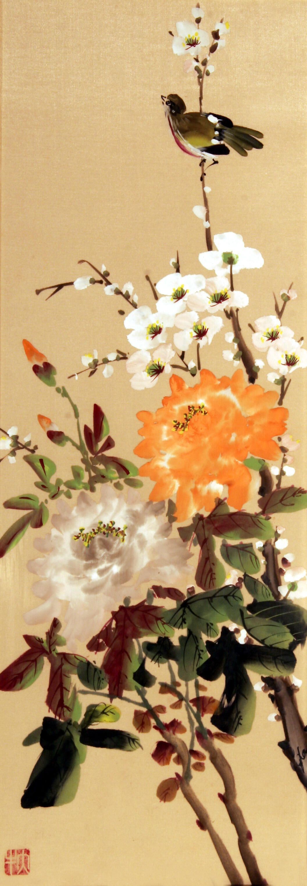 The third panel of three depicting various flowers and blossoms on branches. A small bird perches on a branch in the upper right hand corner of the image.Acquisition