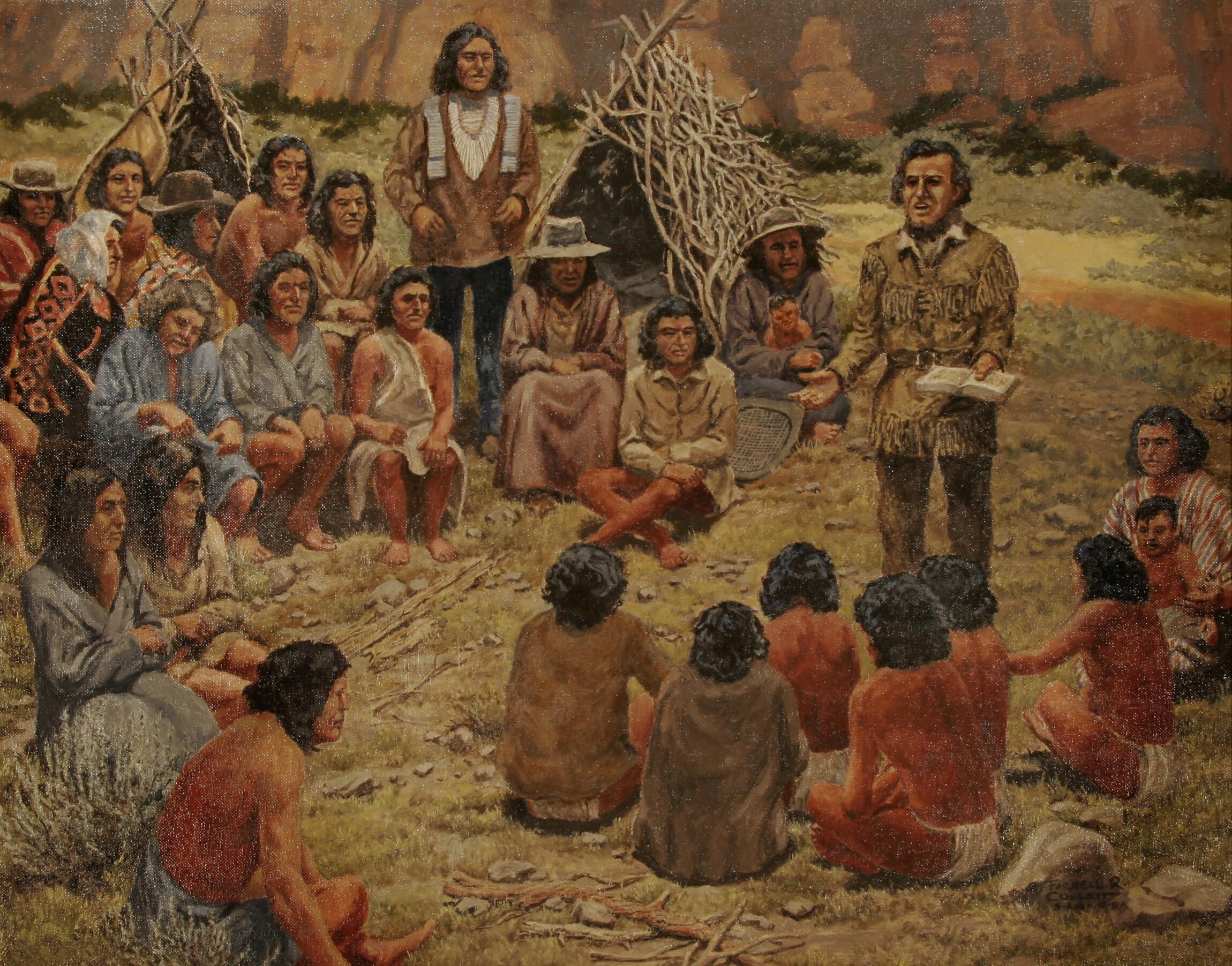 Historical figure Jacob Hamblin while standing is preaching to a circular group of Native Americans. All but one of the Native Americans are seated. There are two teepee-shaped stick structures in the background.Acquisition