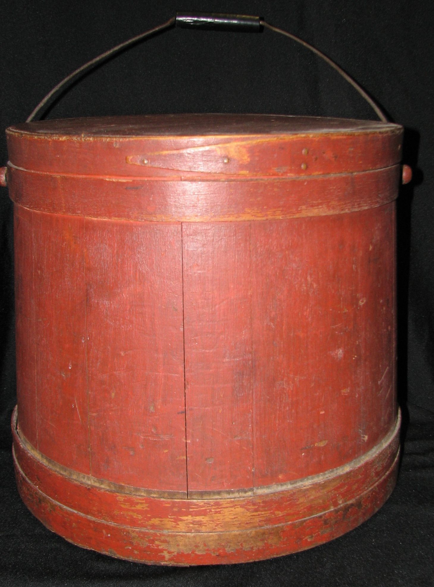 A large wooden vessel or cask, 14" diameter, red in color, wire bale handle -- used for butter, lard, etc.Acquisition