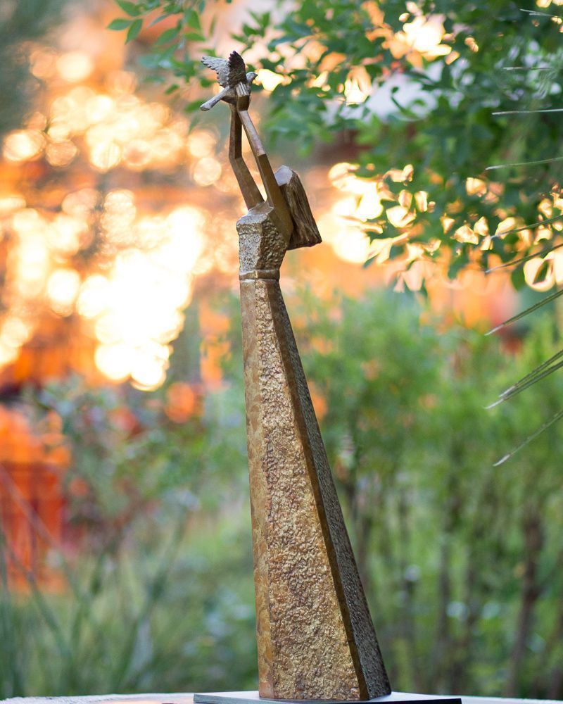 Bronze Sculpture on a street Stylized sculpture of a woman holding a bird aloft in her hands - the bird has it's wings extended.