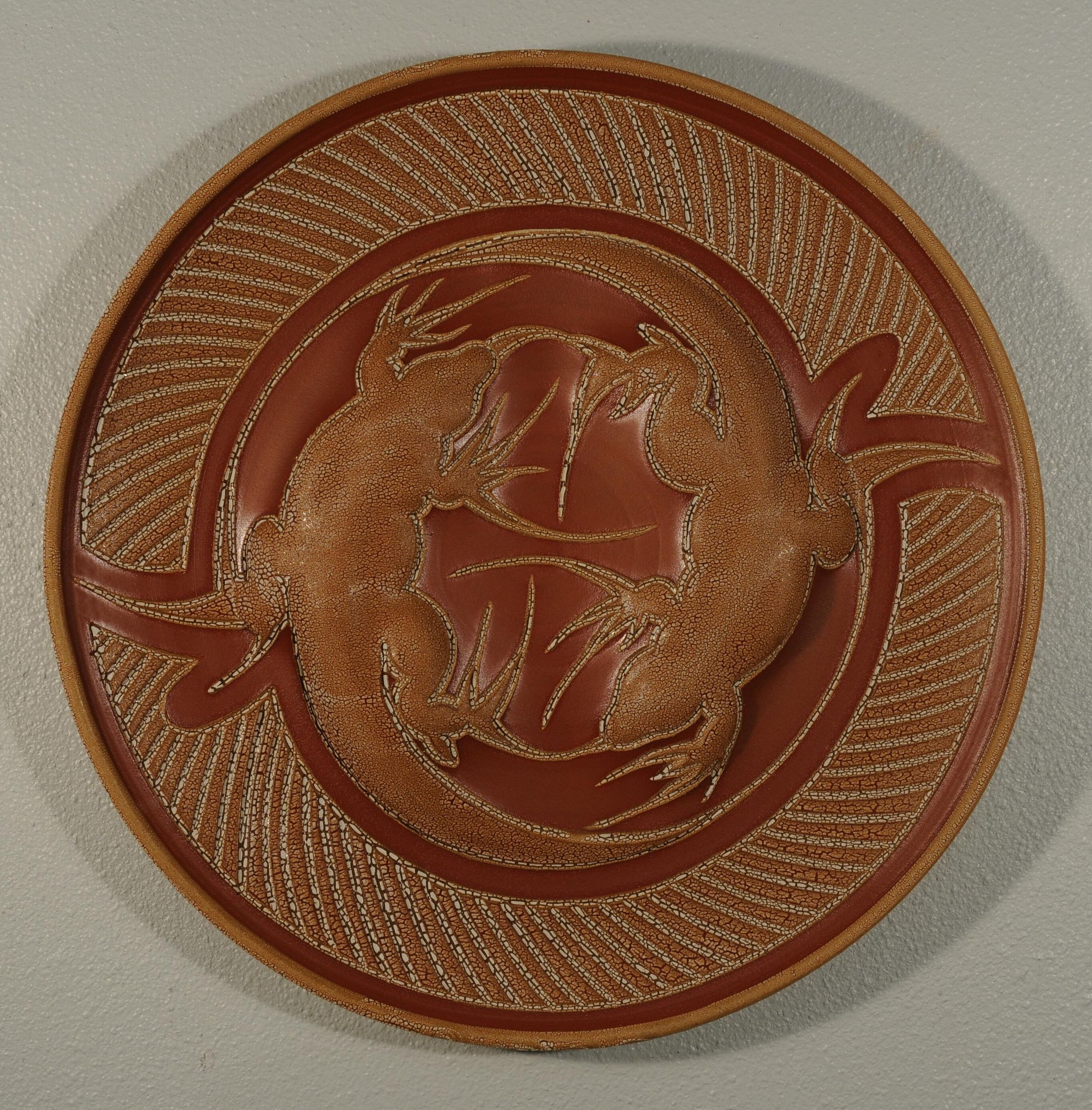 Ceramic platter, 17-1/2" diameter, with 2 raised lizards, light and dark terra cotta colors, and white crackle finishAcquisition