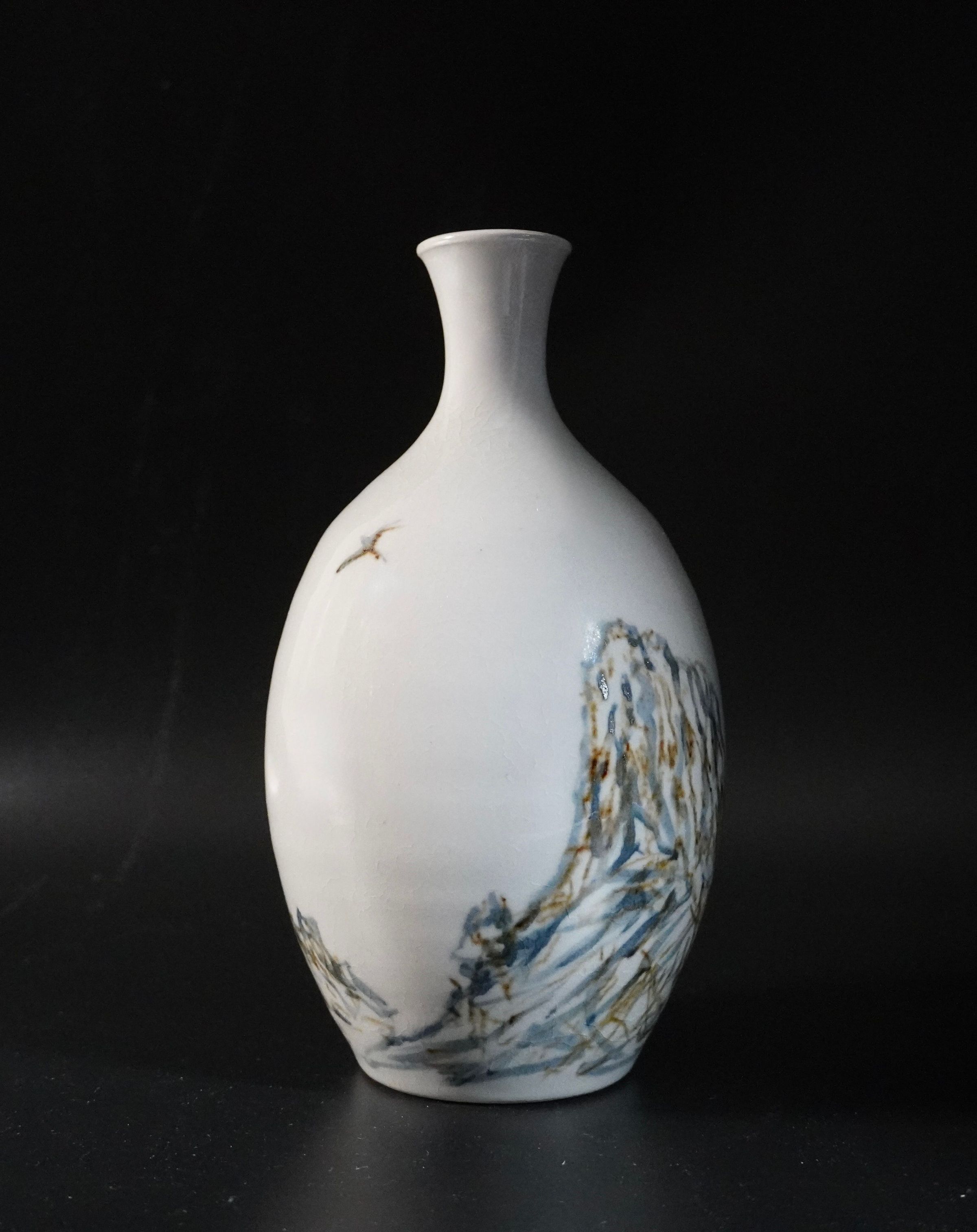 Ceramic, White vase painted with blue, green, and brown mountains and birds. Glazed PorcelainAcquisition