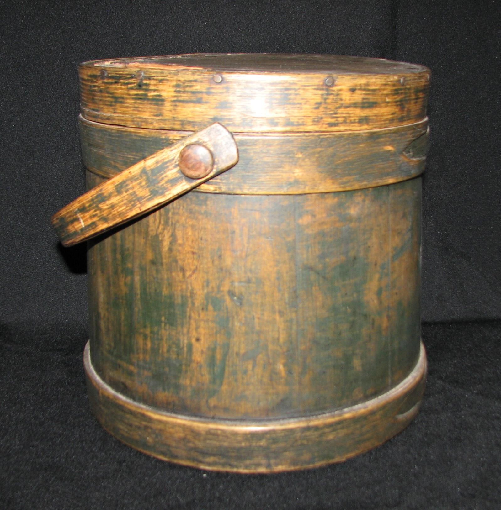 A wooden vessel or cask, 11.5" diameter, brown wood stain color, with wooden handle -- used for butter, lard, etc.Acquisition