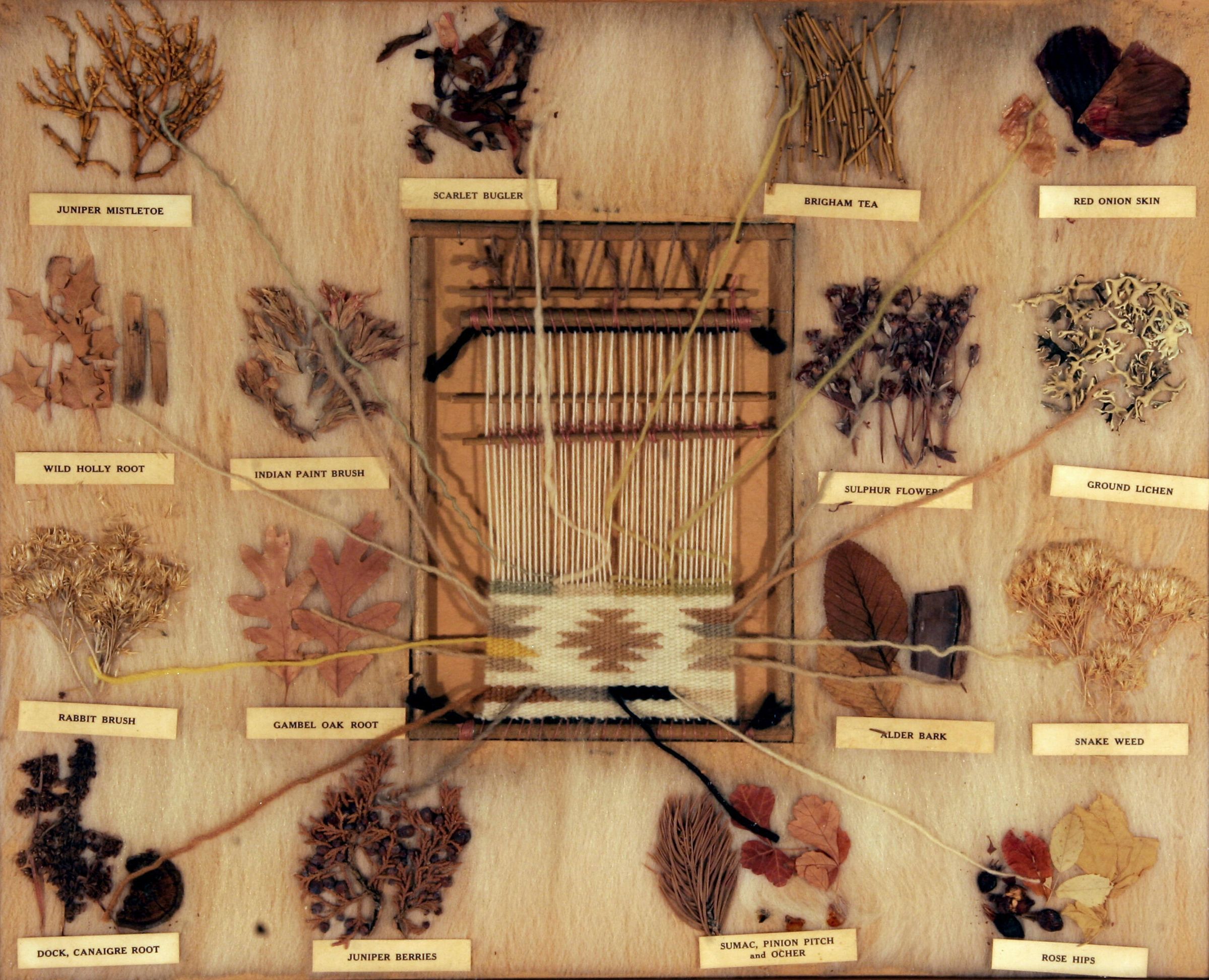 A loom with a partially completed Navajo rug is shown. Surrounding the loom are the natural objects from which the dyes to color the rug are extracted.Acquisition