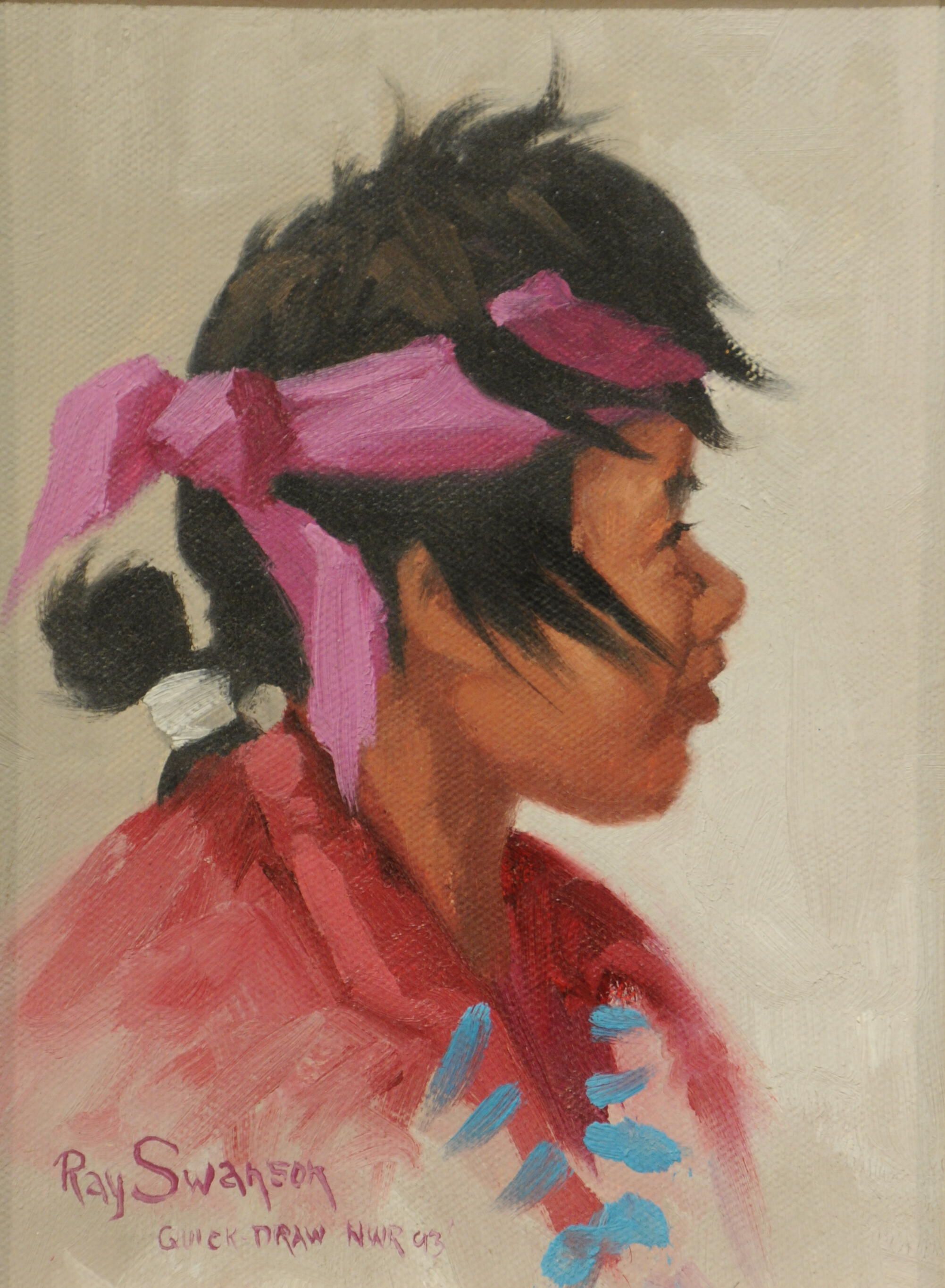 Painting on masonite, probably acrylic, 6" x 8" in rustic wood frame - 12-3/4" x 15". Was painting at the Northwest Rendevous art show in Helena, MT in 1993 for the "quick draw" auction. Painting is numbered 1657. Art is signed Ray Swanson Quick Draw NWR 93.Acquisition