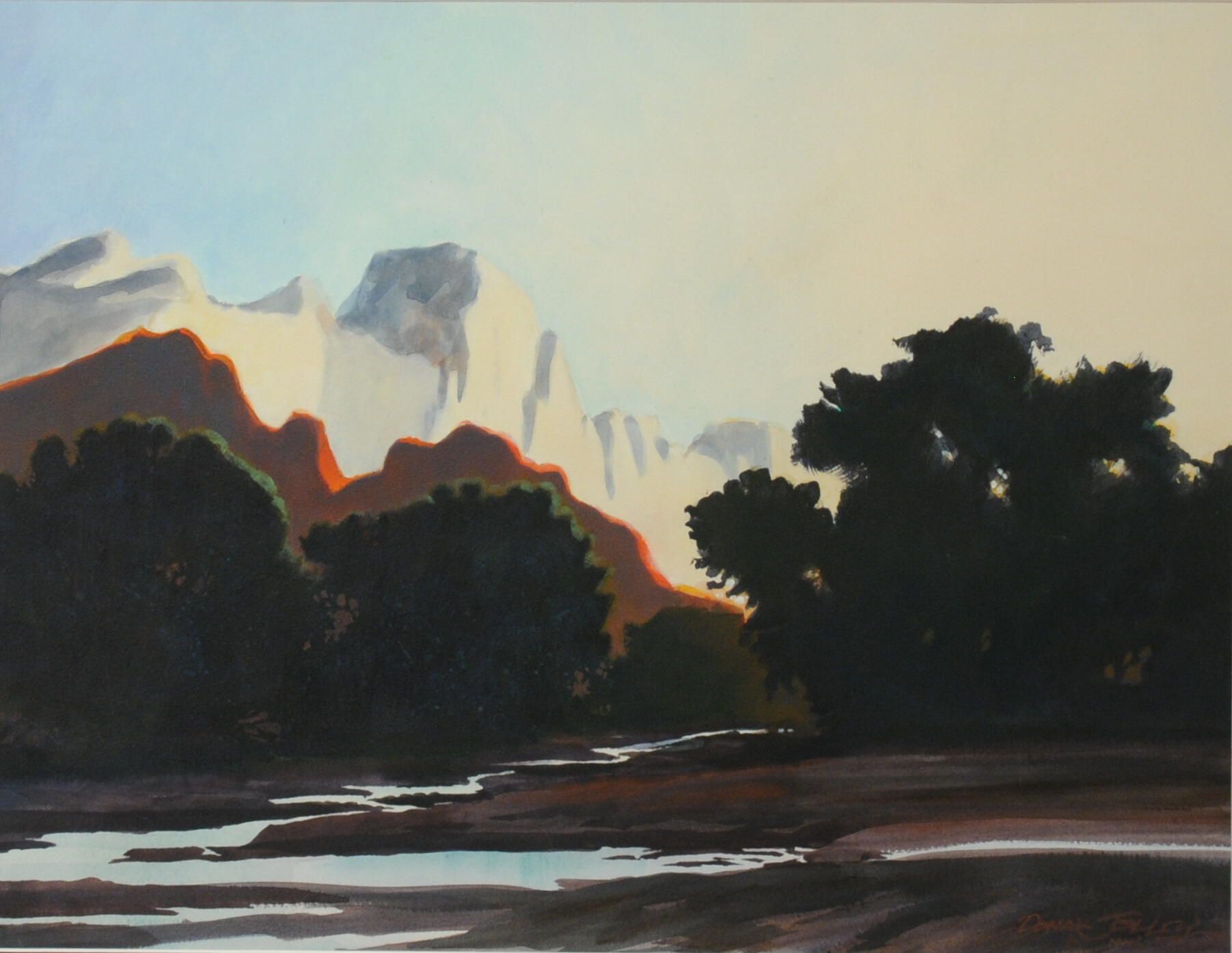 Zion National Park, Watercolor on paper, 17-1/2" x 22-1/2", unframed. Notation on back says: Was 84010 Sentinel Sunrise - repainted (0815) because of tear across 80410 (lower left corner. This peice is the original (first painting) with the tear which has been mended.Acquisition