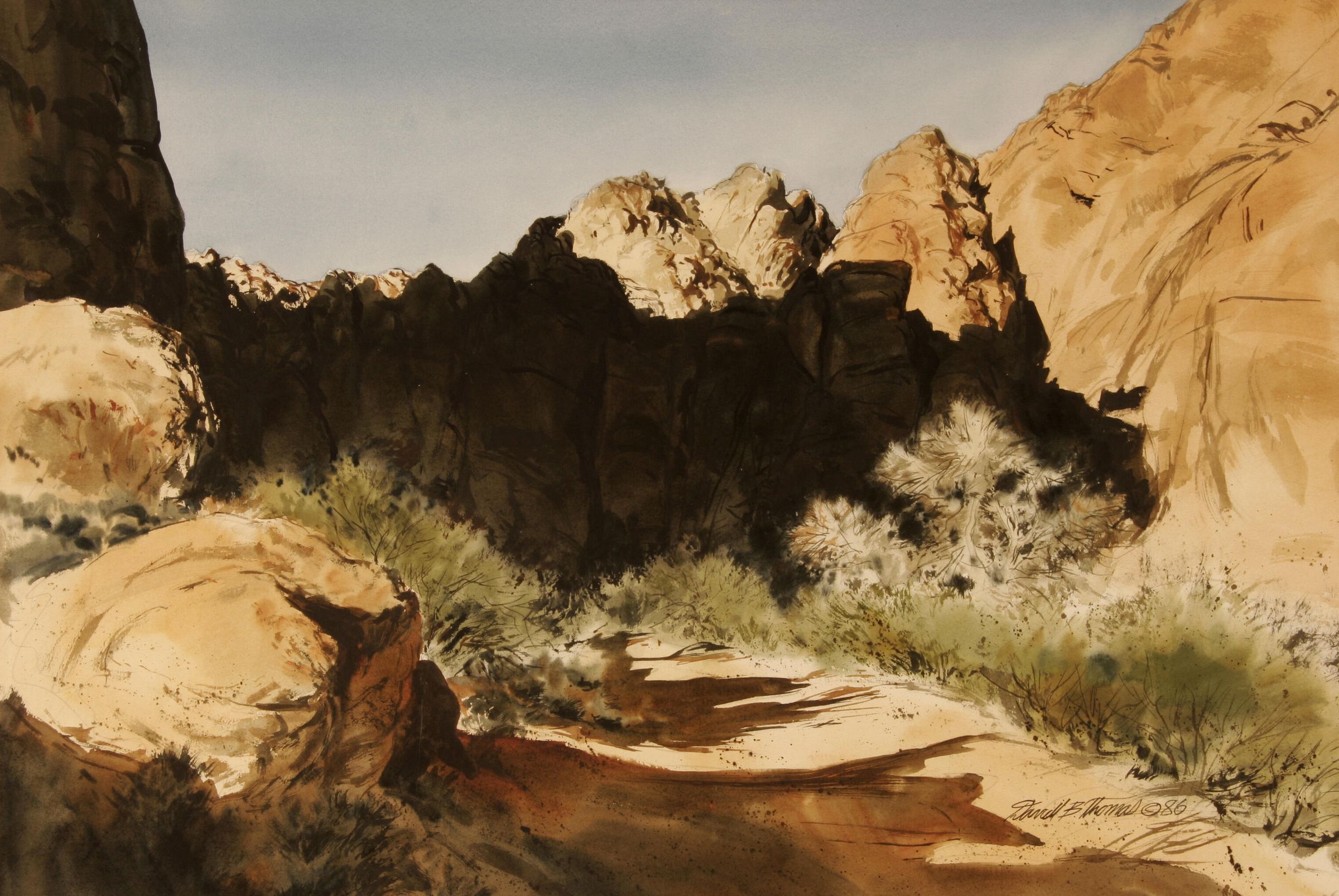 A trail or sandy wash leads pass boulders in the foreground into a rocky, heavily shadowed canyon. Desert vegetation is depicted along the path.Acquisition