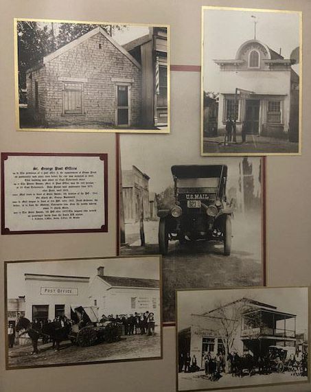 Group of five black and white photographs with text panel depicting area post offices and mail delivery from 1862 through the turn of the century.Acquisition