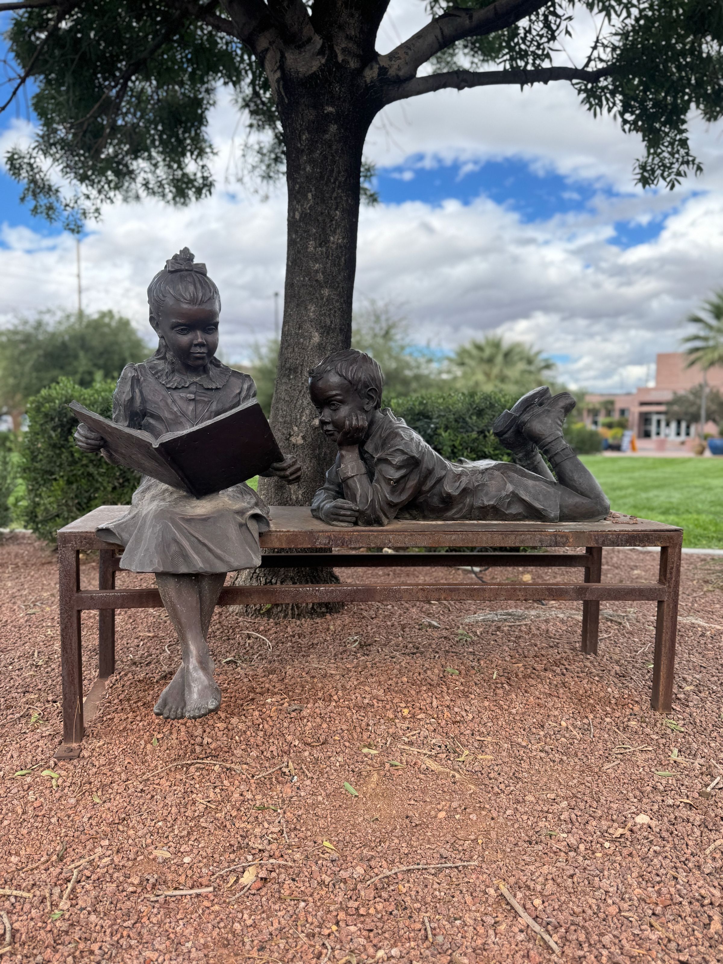 Young girl reading book (Chloe & Cole and Teddybear inscribed) to younger boy laying on the bench.