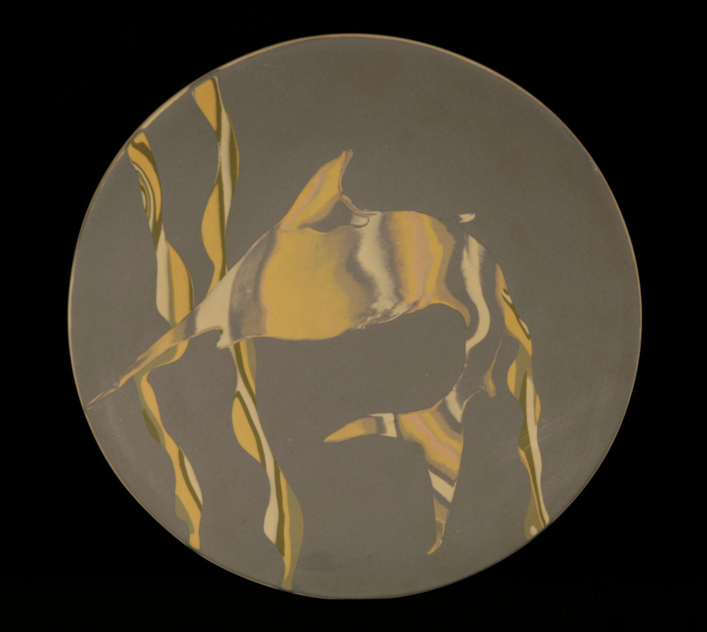 Ceramic plate showing a yellow, blue,and white swordfish, its body curved, against a blue background. The colors of the swordfish are repeated in rippling lines on the plate.Acquisition