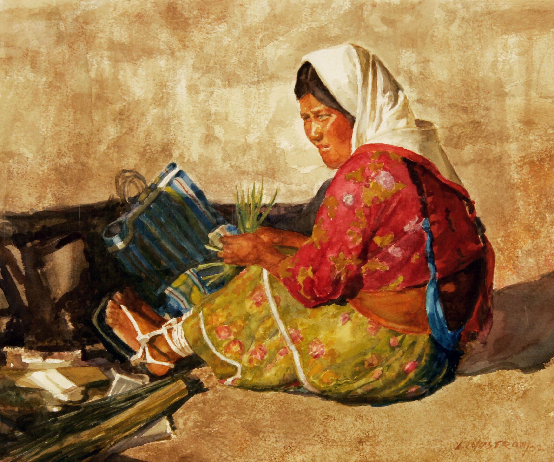 Seated woman weaving a basket. The image of the woman fills about 1/3 of the extreme foreground. She wears a white scarf, bright red blouse and a bright yellow-green skirt. Near her sandalled feet are a striped bag and materials for weaving baskets. The background and the foreground upon which she sits is a muted earth tone beige color.Acquisition