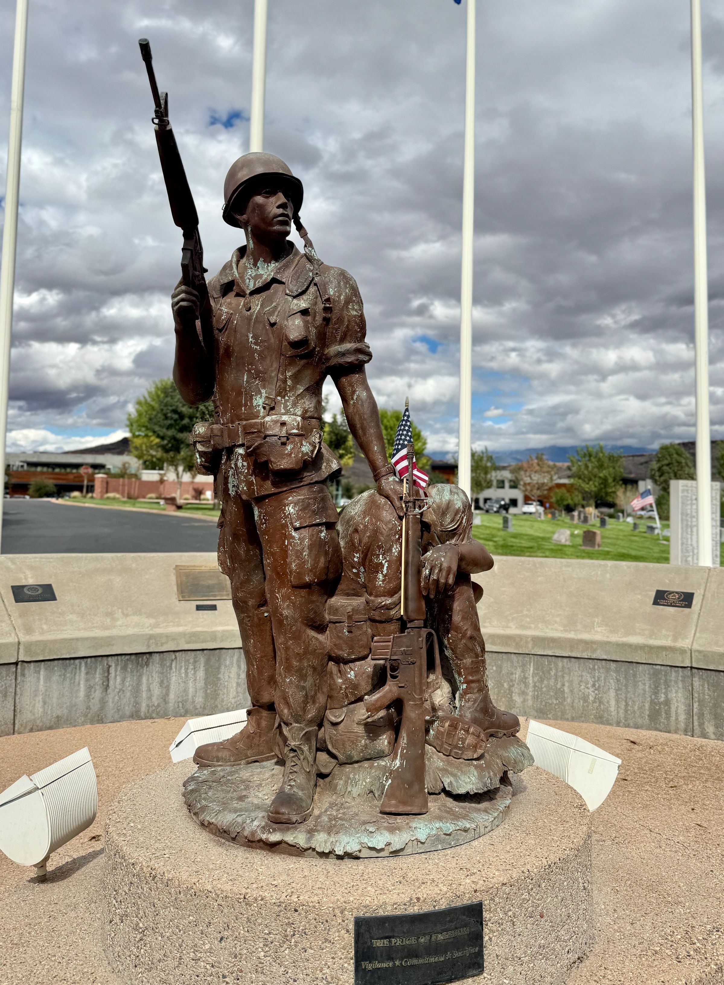 A soldier is comforting another soldier, sitting down, both holding guns.