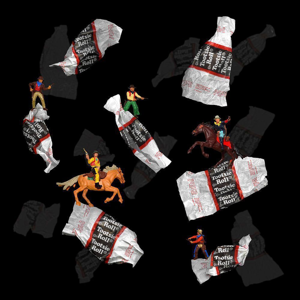 A digital collage of Tootsie Roll wrappers and cowboy figurines.