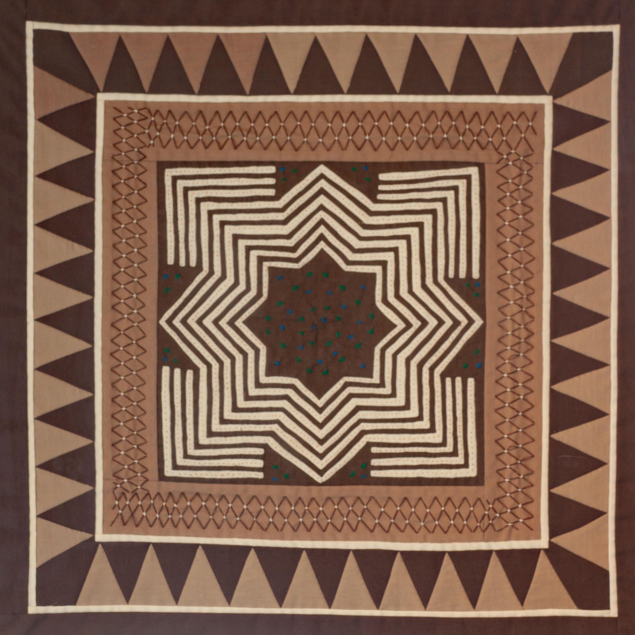 Eight pointed star with blue and green embroidered accents in a concentric pattern predominantly in shades of brown and white. An art form of the Hmong people of Southeast Asia.Acquisition