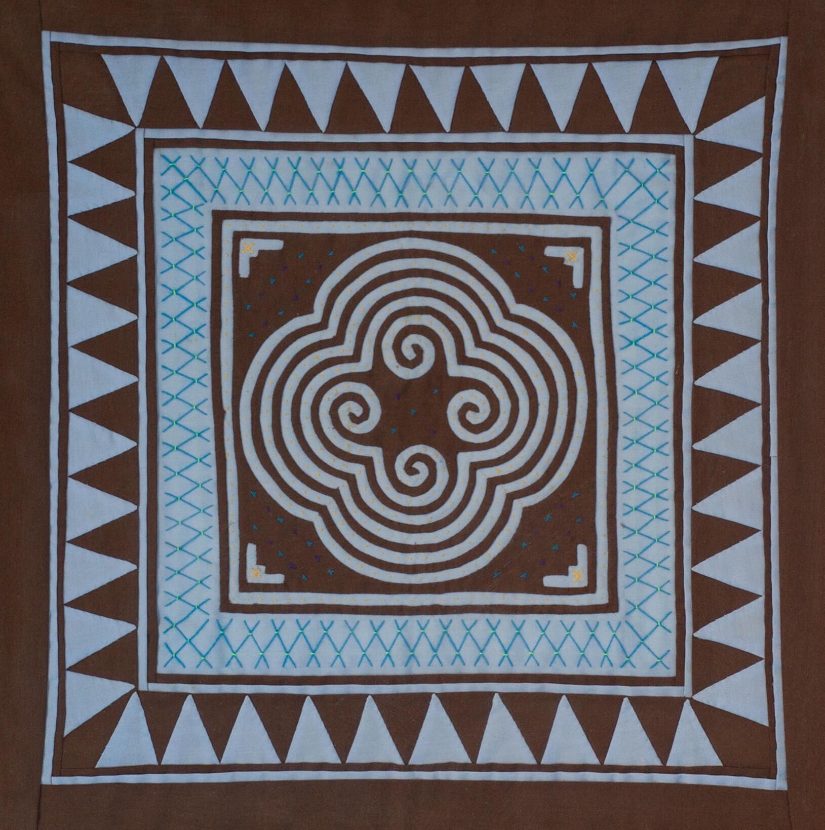 Quatrefoil design in a concentric pattern predominantly in shades of blue and brown. An art from of the Hmong people of Southeast Asia.Acquisition