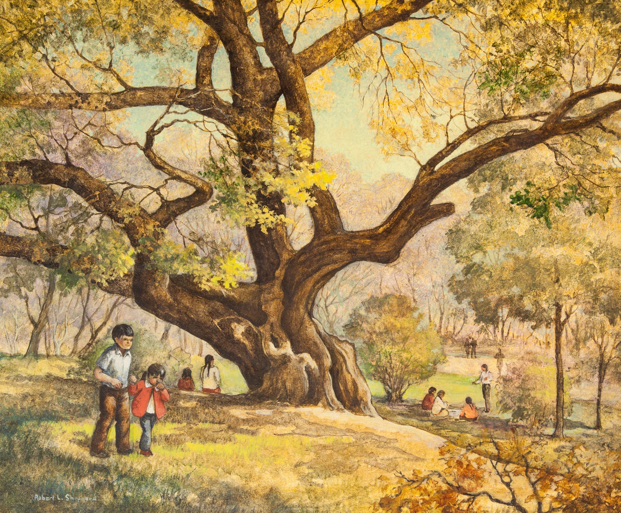 Very large tree with wide spreading branches. Two small children, a boy and girl are walking, holding hands in the foreground. Several other children and adults are in the background in a park like setting.Acquisition
