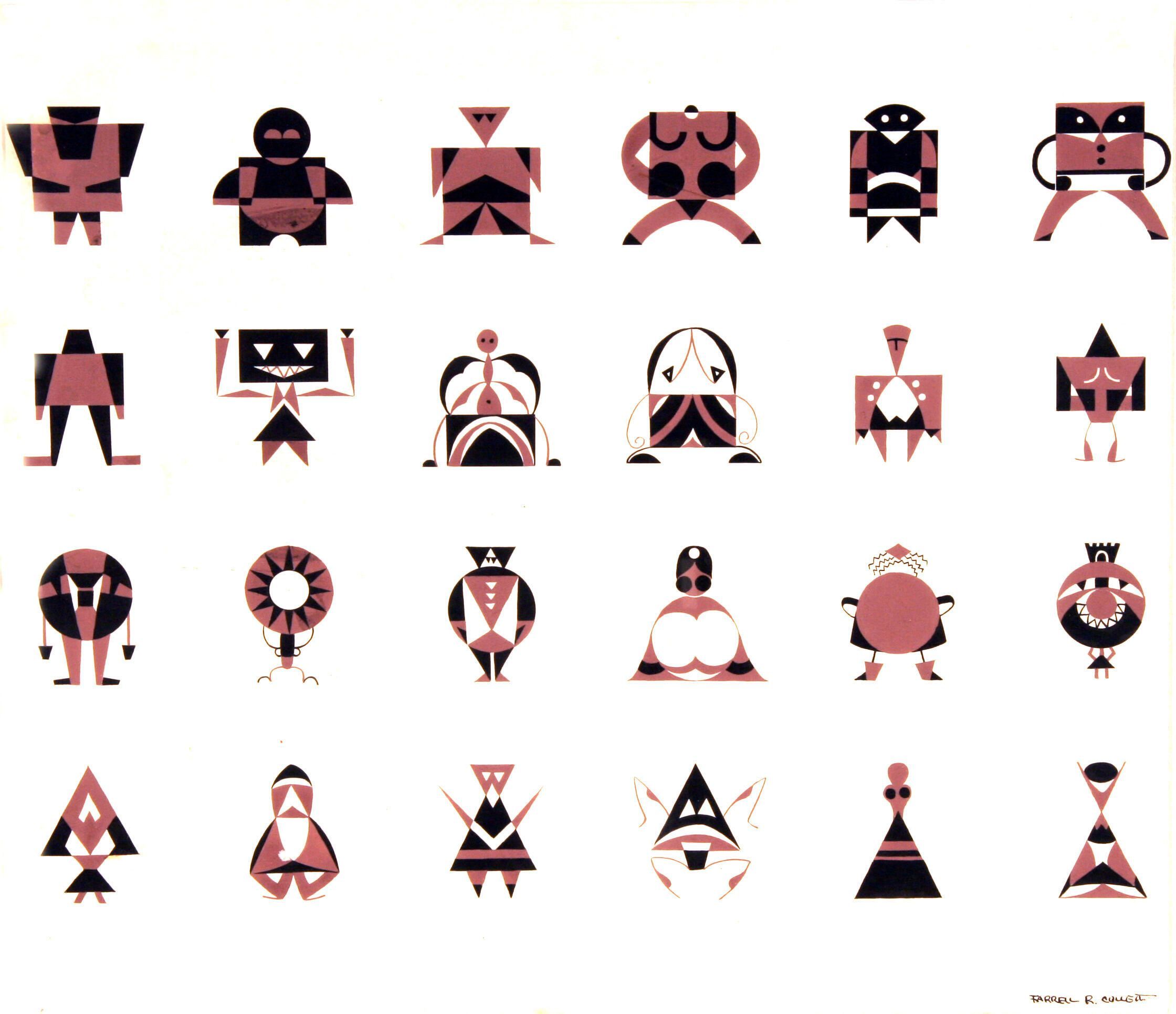 4 horizontal rows of 6 abstract geometric figures in each row. Figures are a combination of black, brown, or white (color of background paper) colors.Acquisition