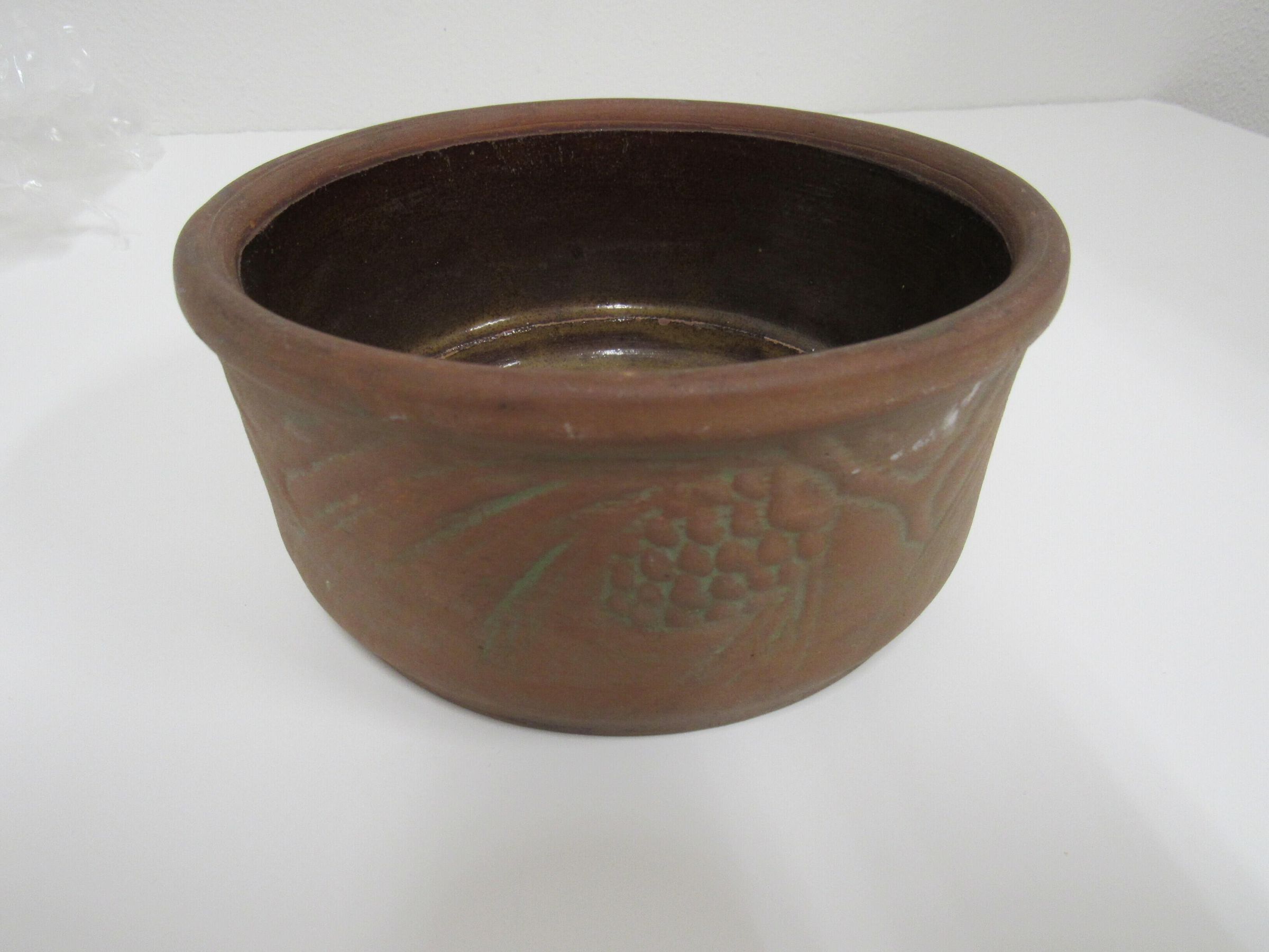Bowl, undated and unsigned - 3" high x 6" diameter with pine cone and needle embellishment. Appear to be terra cotta with green tints.Acquisition