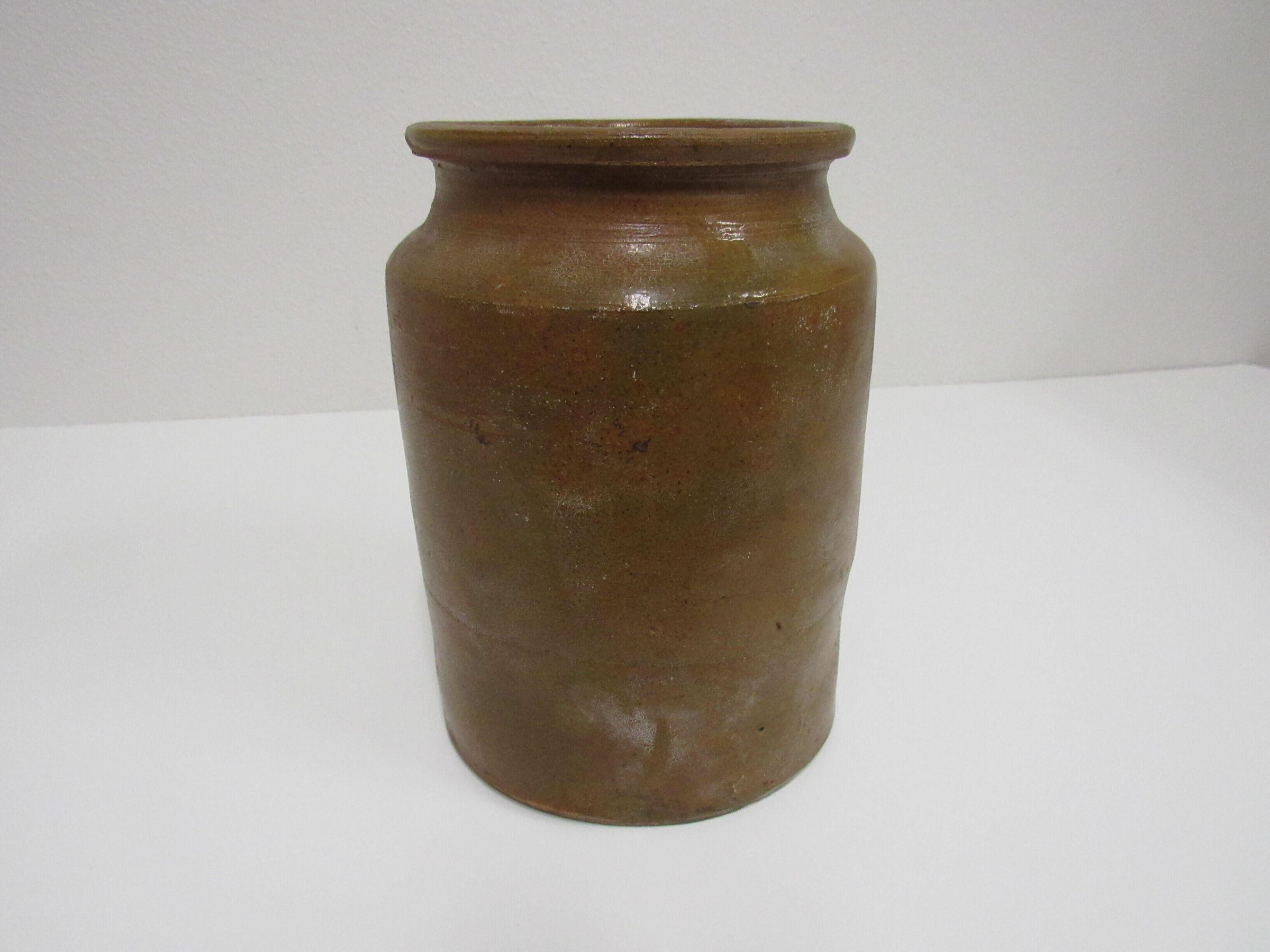 Crock, undated and unsigned - 8-1/2" tall x 6" dia, unembellished. Appears to be terra cotta with green/gold glazeAcquisition