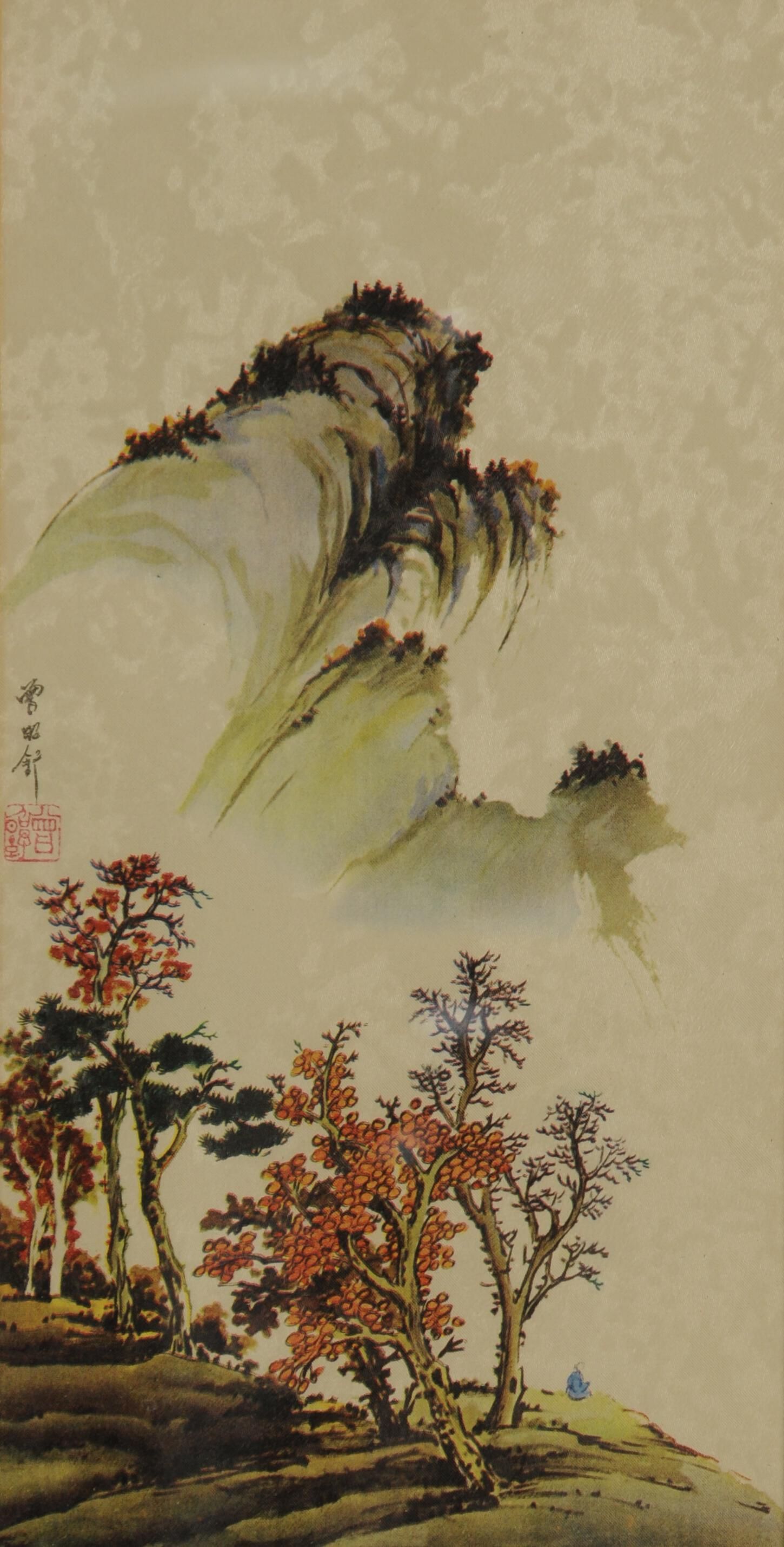 assumed to be Japanese watercolor on silk, 10" x 5", matted and framed one of 4, all the same size and frame with same artist chockAcquisition