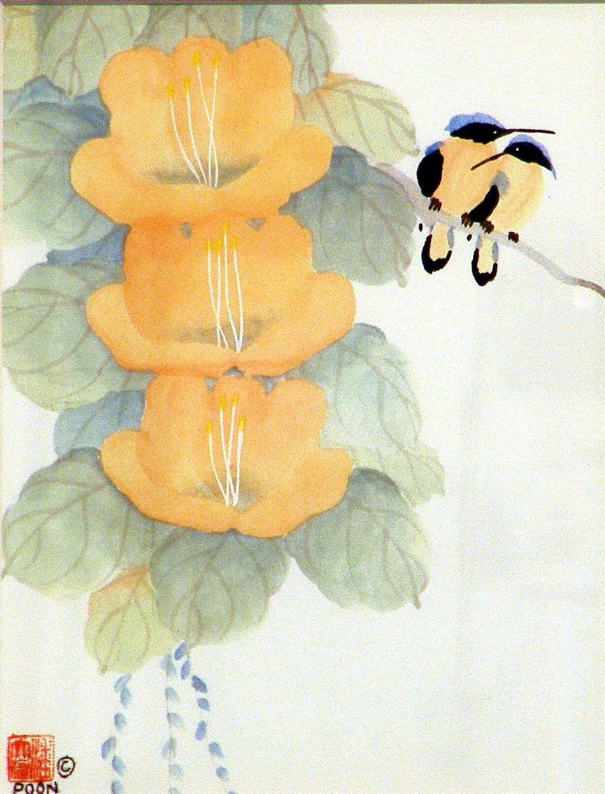 Watercolor on silk painting depicting two birds with flowers