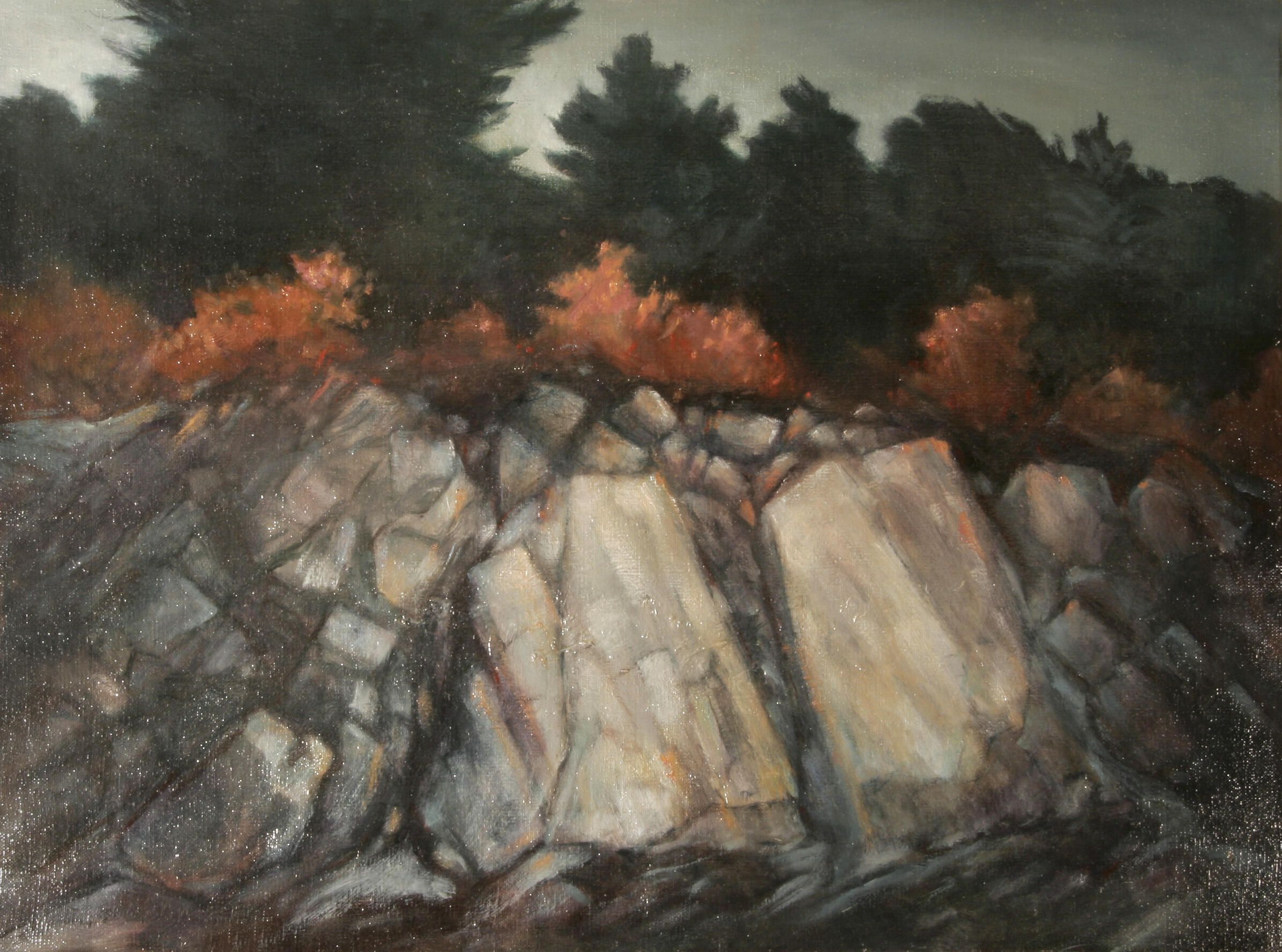 The rocky face of the gray granite quarry is depicted. Above the rocks there are shrubs with autumnal colors and beyond them a dark shadowed forest.