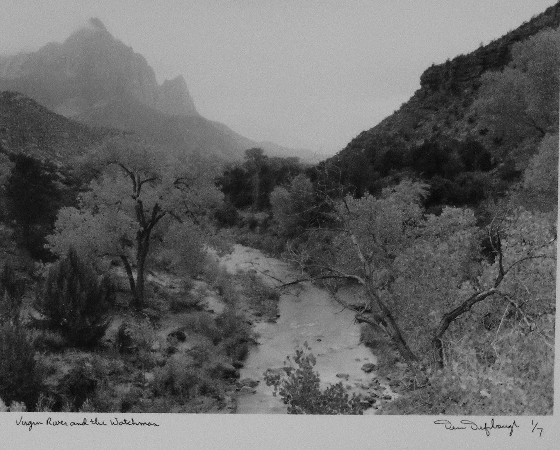 Photograph of The Watchman shrouded in fog with the Virgin River in the foreground in Zion National Park