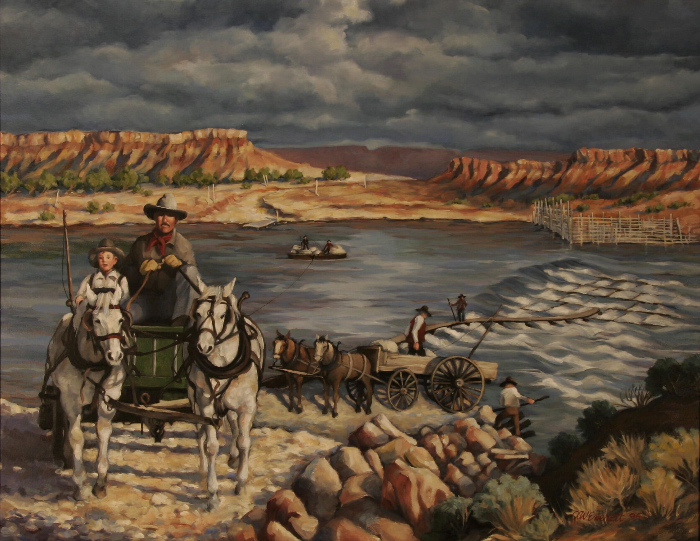 Horses and wagons with figures are in the foreground. The Virgin River is depicted next with figures constructing the dam. There is also a barge with figures in the middle of the river. The background has typical Southern Utah mesas.Acquisition